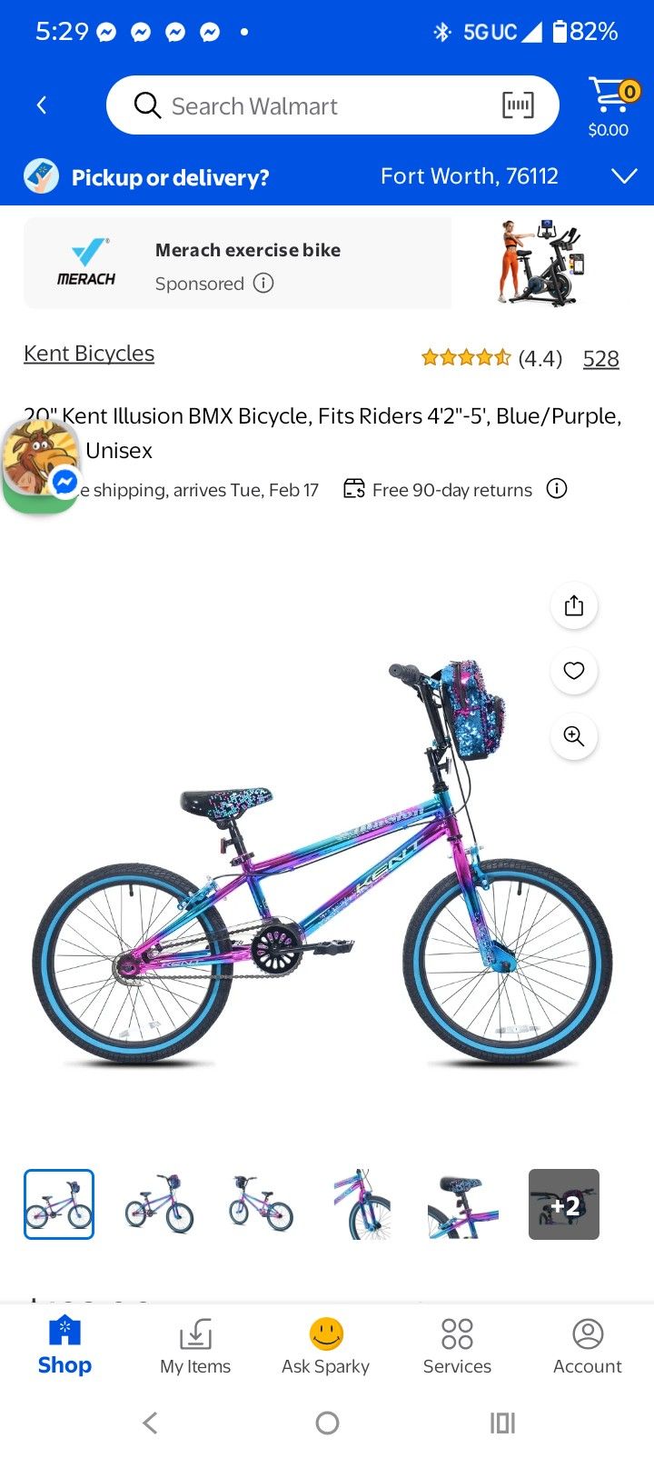 Kent Illusion BMX Bicycle in blue/purple. Price: Starting around $107.00. Features: Fits riders 4'2"-5', includes a sequin bag mounted on the handlebars, and features a steel frame. Type: Single-speed BMX/Freestyle bike with front and rear side-pull brakes. Dimensions: 20-inch wheels with aluminum rims.