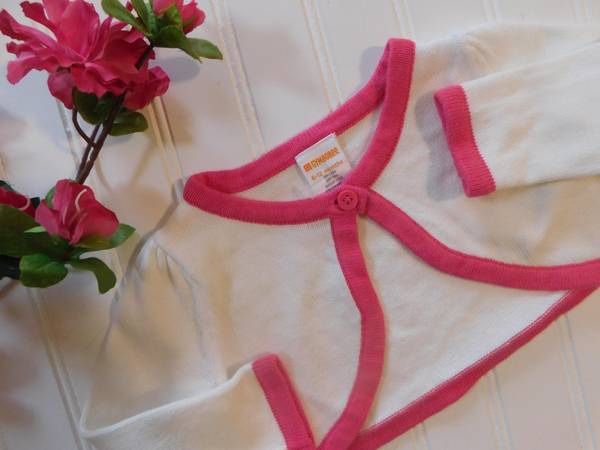 Gymboree baby girls size 6-12 months white cardigan short sweater. Bolero or shrug style. Looks cute over a dress or pants and jeans. White with pink trim. Excellent condition. - girls clothes 6-12 months girls sweater girls easter sweater girl clothing 6-12M 6-9M 6-9 months