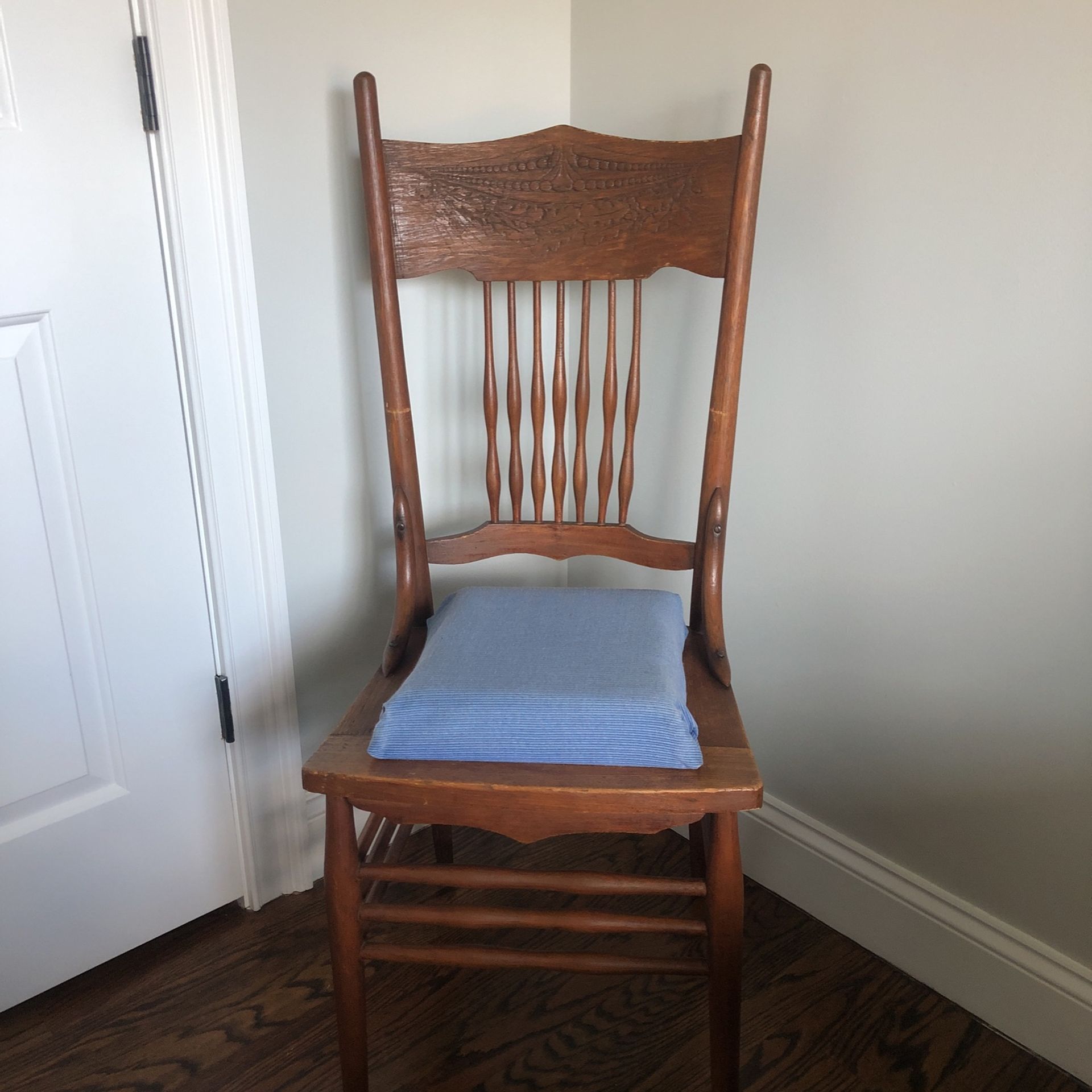 17 front wide by 15 long. Strong, wood made vintage chair. Great tor children’s desk. Blue cushion is attached to the seat for comfort. The fusion was just redone. It’s brand new.