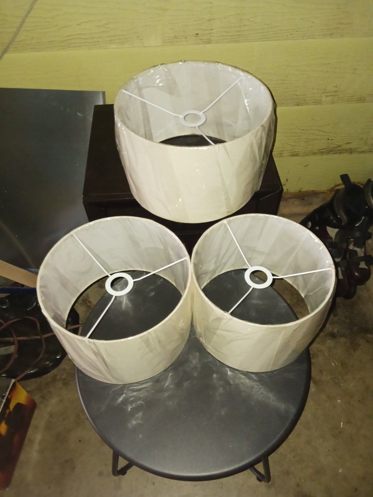 3 matching lamp shades. 3 different sizes but all similar in size. Matching colors. All are white and cylinder shaped. Brand new, still in the package. Can be sold together as a set or individually. Sizes: all 3 shades are approximately 8 inches in height. Big shade is 12 inches in diameter. Medium shade is 11 inches in diameter. And small shade is 10 inches in diameter.