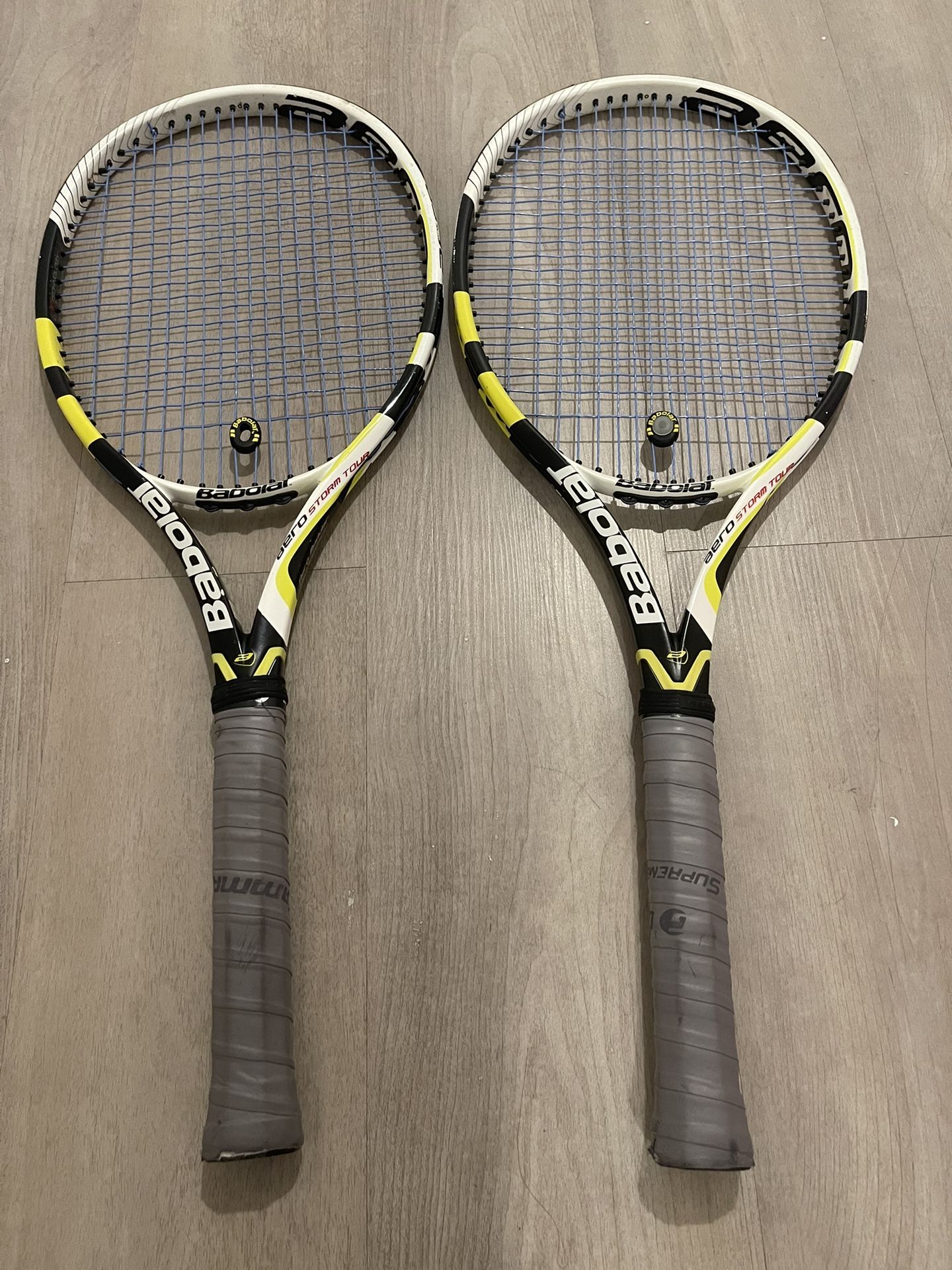 Selling 2 used Babolat Aero Storm Tour tennis rackets. Normal wear, no cracks. Frames are solid. Comes with 1 replacement head guard grommet set. Nadal tour bag for free. Grip size 4 1/2 Asking $80 for both Prince Wilson head