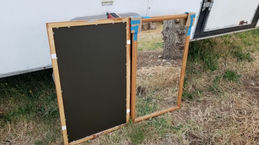 Two matching bathroom mirrors. Wood frames. Has attached hanging hardware. 20"x33-1/2". Has some paint marks. Was going to paint them black. The blue tape and cardboard are temporary to cover the sharp mounting hardware. $40 for both mirrors.