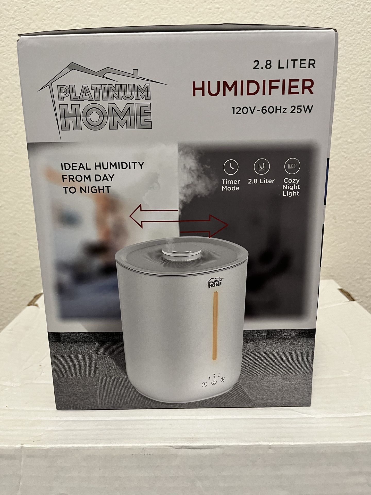 Platinum Home - 2.8 Liter Humidifier - (New) 7.5" X 7.1" X 9.8" Water Capacity - 2.8L - 12 Hours Cozy Night Light Timer Mode/ Sleep Mode Touch Button 3 - Mist Settings - High/Medium/Low 360 Degree Mist Nozzle Up To 24 Hours At Low Mist Level/ 12 Hours Of High Mist Top Fill Design , Easy To Refill