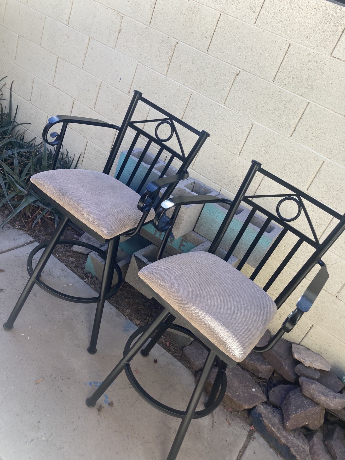 Set of 2 metal barstools with arm rests. Metal frames are solid and in great condition, fabric on seats have a couple of wear spots at the front of the seats but lots of life left in them. Floor to Seat Height: 28" Floor to Top of Arm Rest Height: 37 1/2" Floor to Top of Seat Back Height: 44" Pick up from Gilbert & Guadalupe