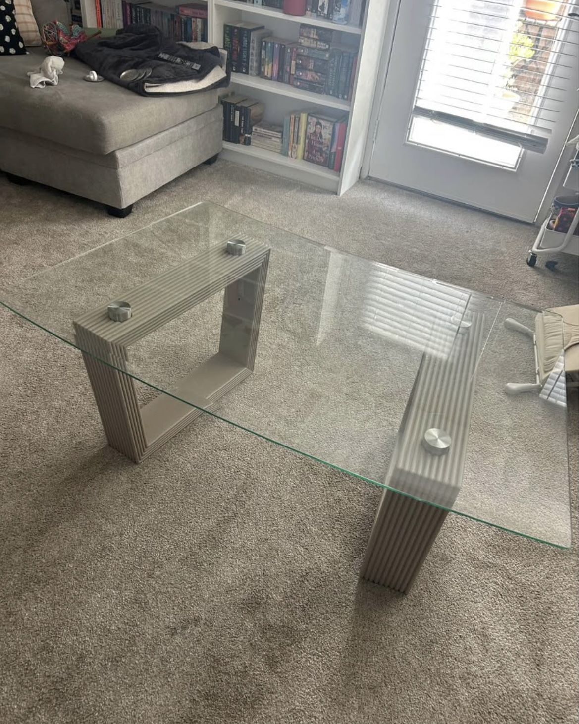 Super cool structural shape coffee table with a modern aesthetic. Glass is in great condition though there’s a few surface scratches. It is removable for easy transport and then screws on securely. Size is 50” at widest, 29 at the deepest, height is 18.