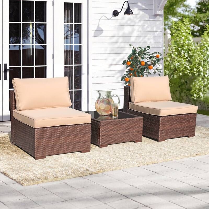 New 3 Pieces Wicker Outdoor Patio Sofa Set Beige New in box DSTB003L With high-quality padded seats and back cushions, you can relax in comfort while entertaining your guests. The sturdy wicker construction ensures durability, making it perfect for year-round use. Enjoy your leisure time to the fullest whether sitting or lying down. Make your outdoor space extraordinary with our modern design. Features * Cushion Pro Technology: Experience ultimate comfort with our cushion technology. The thick seat cushions provide excellent support and are resistant to fading, staining, and mildew, ensuring long-lasting comfort. * Sturdy and durable - The internal structure of the outdoor table and chairs features solid steel, providing strength and rust resistance. Each patio sofa can withstand a weight of up to 367 pounds. The outdoor sofa's polyester fabric resists fading and puckering, remaining in excellent condition even with long-term use. The durable synthetic PE resin wicker of the outdoor furniture set will remain intact in harsh environments, providing an optimal experience. * Charming patio furniture addition - This porch furniture is a functional and stylish addition to your outdoor space. The unique rattan weave adds texture to the outdoor sofa, complementing its modern-traditional look. The versatile outdoor combination patio sets are suitable for various locations, including the patio, porch, backyard, balcony, poolside, and garden. * Versatile and stylish: With a neutral color scheme, these chairs effortlessly blend with any outdoor décor style. Create a cozy and stylish outdoor space, whether it's modern, traditional, or tropical. * Streamlined Assembly: Assemble required, clear instructions, and all necessary hardware are included.