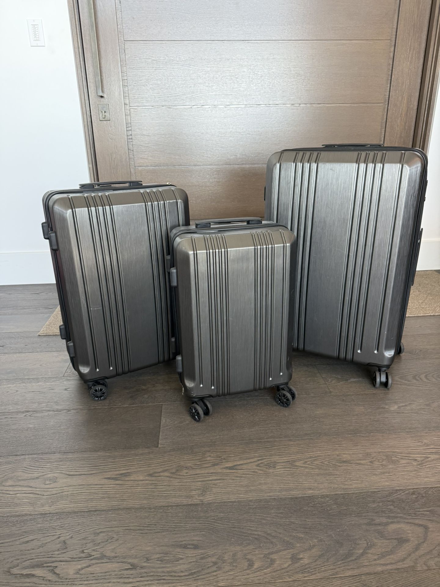 I’ve got four identical luggage sets available, all in great condition. We bought these last year and used them only on two trips. Nothing’s broken, or worn — we’re just switching to soft luggage. $75 for each set. Each set includes: 3 hard-shell suitcases (small/medium/large) — great for checked and carry-on travel. TSA-Approved Lock for Safe Travel. 360° spinner wheels for easy maneuvering at the airport. Expandable design on at least the largest size to add extra packing space. Telescoping handles and organized interiors. Item is currently available on Amazon for $149.99