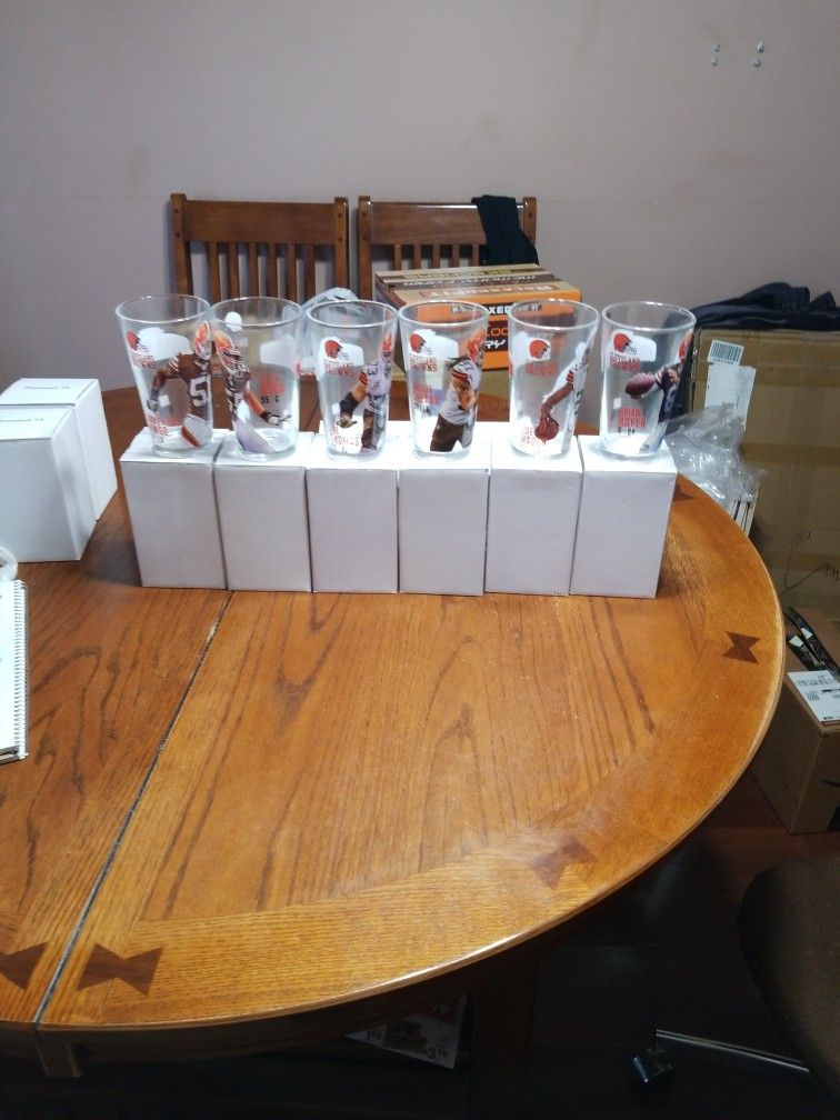 Mingo, Mack, Thomas, Sheard, Haden and Hoyer Cleveland Browns glasses from Papa John's. New with boxes. Set of 6.