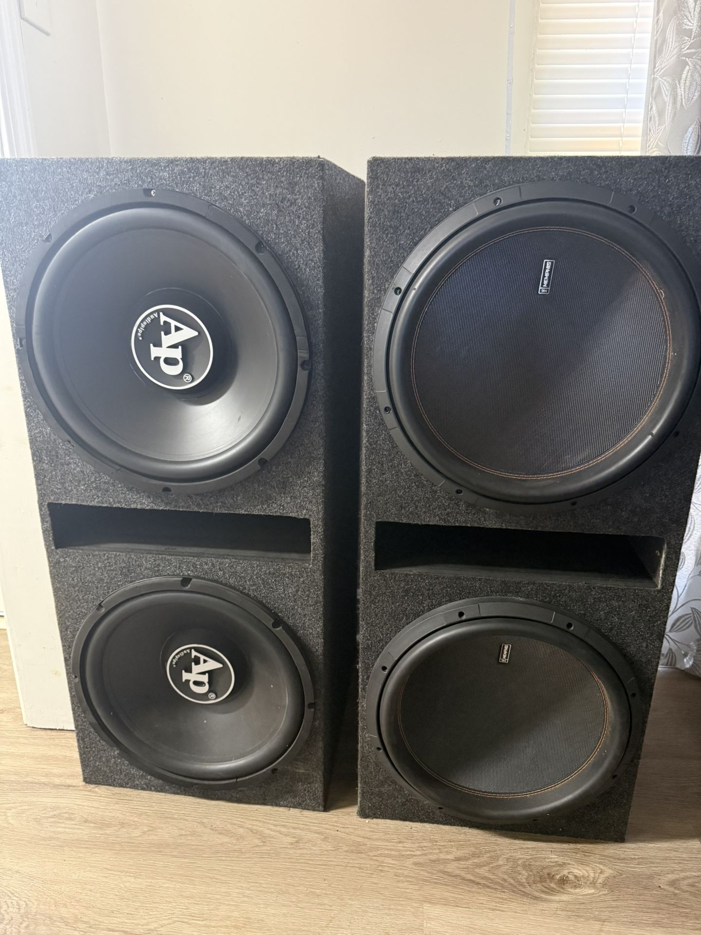Memphis M6 15in ( With Amp $600 obo) Key Features & Specifications Power Handling: 900 Watts RMS / 1800 Watts Peak. Voice Coils: Available in Dual 2-ohm (15-M615D2) or Dual 4-ohm (15-M615D4). Design: Vented cast aluminum basket for cooling, with a 120oz magnet. Construction: Reinforced spider and fiberglass-reinforced paper cone. Dimensions: Approximately 8.5-inch top-mount depth. Audiopipe TXX-BD3-15 15" Triple Magnet 2400 Watt Subwoofer - Dual 4 Ohm (With amp $400 obo) Features: 15" Dual 4 ohm TXX-BD3 Series Subwoofer 220 Ounce Triple stacked magnet design for extreme excursion 3.3 inch 4-layer voice coil 50 mm of linear excursion peak to peak! Woven fiber cone with foam surround Dual ventilation system for efficient cooling 8 AWG Screw Terminal Vented pole piece for thermal efficient system Power Handling Max: Maximum Power: 2400 Watts Power Handling RMS: 1200 Watts nominal continuous power handling RMS