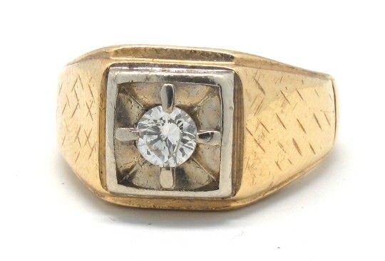 Classy Mens ring with a 40pt round brilliant diamond set in 14K yellow gold.