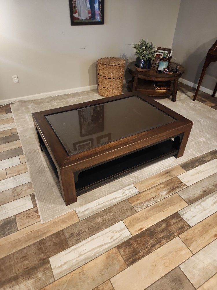 A beautiful dark brown coffee table. It's well made and heavy. There is alot of room perfect for a big family. Dimensions are 38 in x 56in wide and height is 18 in