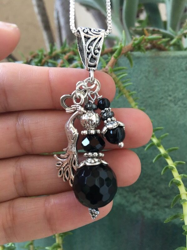 Beautiful handmade necklace!, 925 Sterling silver 30”long chain, black Onix stones, Swarovski crystals, Tibetan silver pendant hanger, spacers & charms! Charm can be changed if you like😊