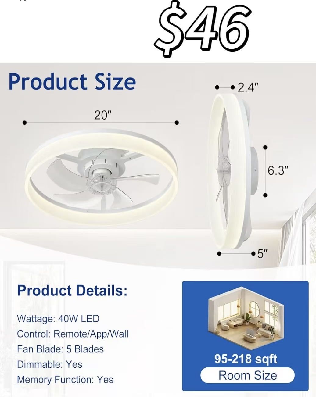 DLLT Modern Ceiling Fans with Lights: 20" Flush Mount Low Profile Ceiling Fan with APP Remote Control - White LED Bladeless Fandelier Dimmable Quiet DC Motor for Bedroom Living Room 🙏pay $46.00 + sale tax by cash or card in person over our Brick-and-Motar store ONLY (final sale). ✌️Not Accept price negotiation through thIs OfferUp App ; The price is as marked. 🛑NOT Accept any online payment method at all, since our store policy requires clients to check items in person. ✌️Pick up at showroom : zip code 80231(😀) or 80223(✌️) or 80241 (🥨)depending on item ✌️Hour : from 10 am to 7 pm(Monday CLOSE) ✌️Pick up at showroom, No shipping, LIMITED delivery option ✌️ ‘’LIMITED Delivery option ‘’ may be available with ‘’EXTRA charge’’ . Please consult ‘’BRICK-and-MORTAR STORE IN PERSON’’ for delivery option & ‘’ EXTRA charge incurred from delivery “.( Can’t provide delivery details through OfferUp App due to complexity.) ✌️please stop by ASAP after all info(including address) provided OR ✌️double confirming “available or not” again if the address info is already provided for days.. 🙏can NOT relocate inquired item to other showrooms but you can wait to see if it is available in other showrooms (current item location zip code can be distinguished by 🥨😀✌️) ✌️ ALL furniture are new and not used at all. However, due to few careless or overweight handling during shipping, transport or assembly, few of them will have mild scratch or dents. So does some inventories in the box. We try our best to photo those in pictures after assembling them. The price is adjusted based on those issue that we notice. ✌️ Item sold as the picture (it is assembled ) or it will be mark as in the boxes 🥰Reminder: Please pay attention to the address I send you. NOT all showrooms carry the item you inquiring. There is higher chance the item may be ONLY available currently in this Specific ADDRESS I send you. If you inquire multiple items, they may be located in multiple different showrooms…please pay attention to address. 🙏 You are welcome to ‘’GENTALLY CHECK ’’ items/ Furniture in PUBLIC showroom before deciding to purchase it or not. 🙏NO RETURN, NO REFUND, NO EXCHANGE