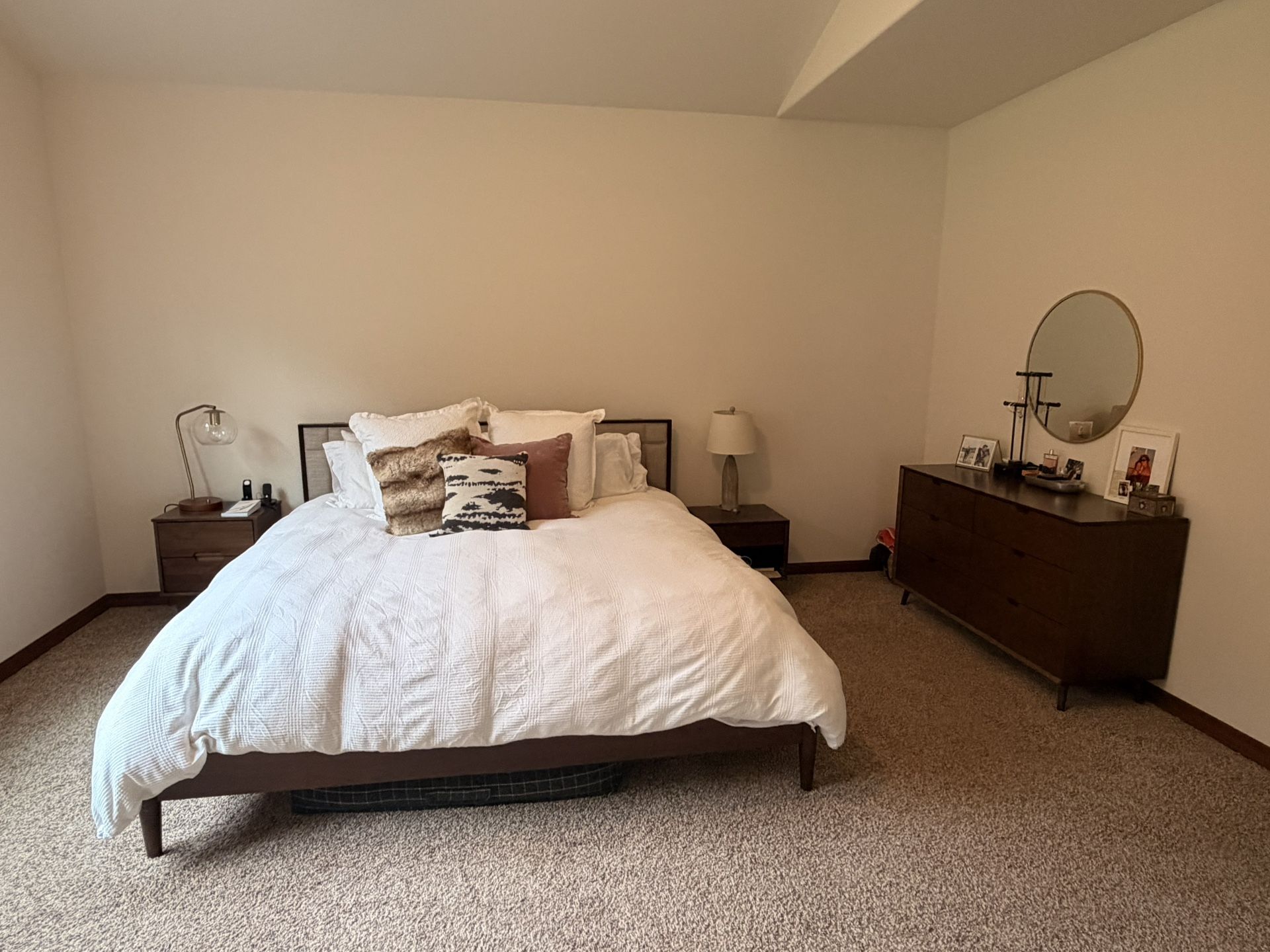 Dania King size bed frame in Walnut with fabric headboard. Mid Century Modern. Has a few scratches that can be colored with a walnut furniture pen. Great condition, just changing bedroom styles. Dimensions: Height: 40.5 inches Width: 81 inches Depth: 86 inches