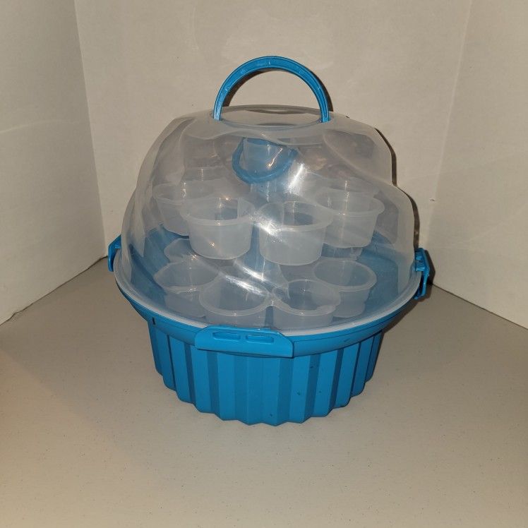 $15.00 Pickup in Hubbard Gently used Cupcake/Muffin 3 tiered carrier. Features 3 removeable tier trays, each with a carry handle and 8 slots for a total storage capacity of 24 cupcakes. Features clear plastic top and red base and resembles a cupcake. Top locks for safe transport, folding handle easy to carry.