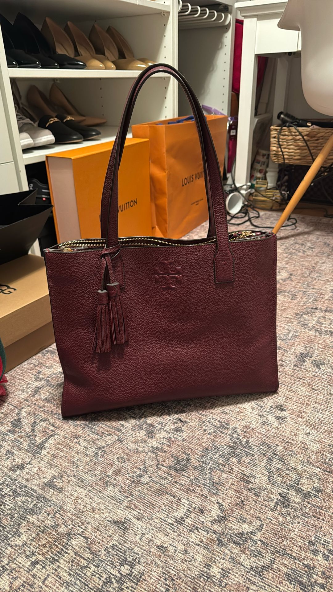 Beautiful burgundy tote for work fits laptop so many compartments this bag was purchased originally $798 beautiful weather Houston for a little bit and I got the new tote so this one I’m trying to sell it’s excellent excellent condition