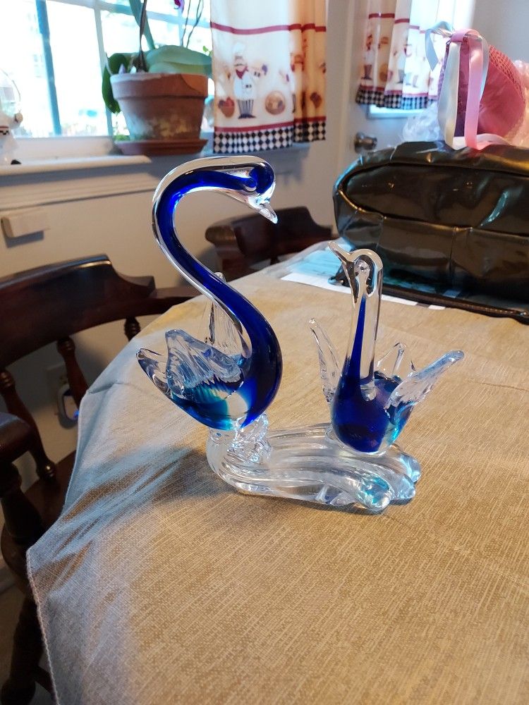 VINTAGE ART GLASS COBALT BLUE AND TURQUOISE SWANS $35.00