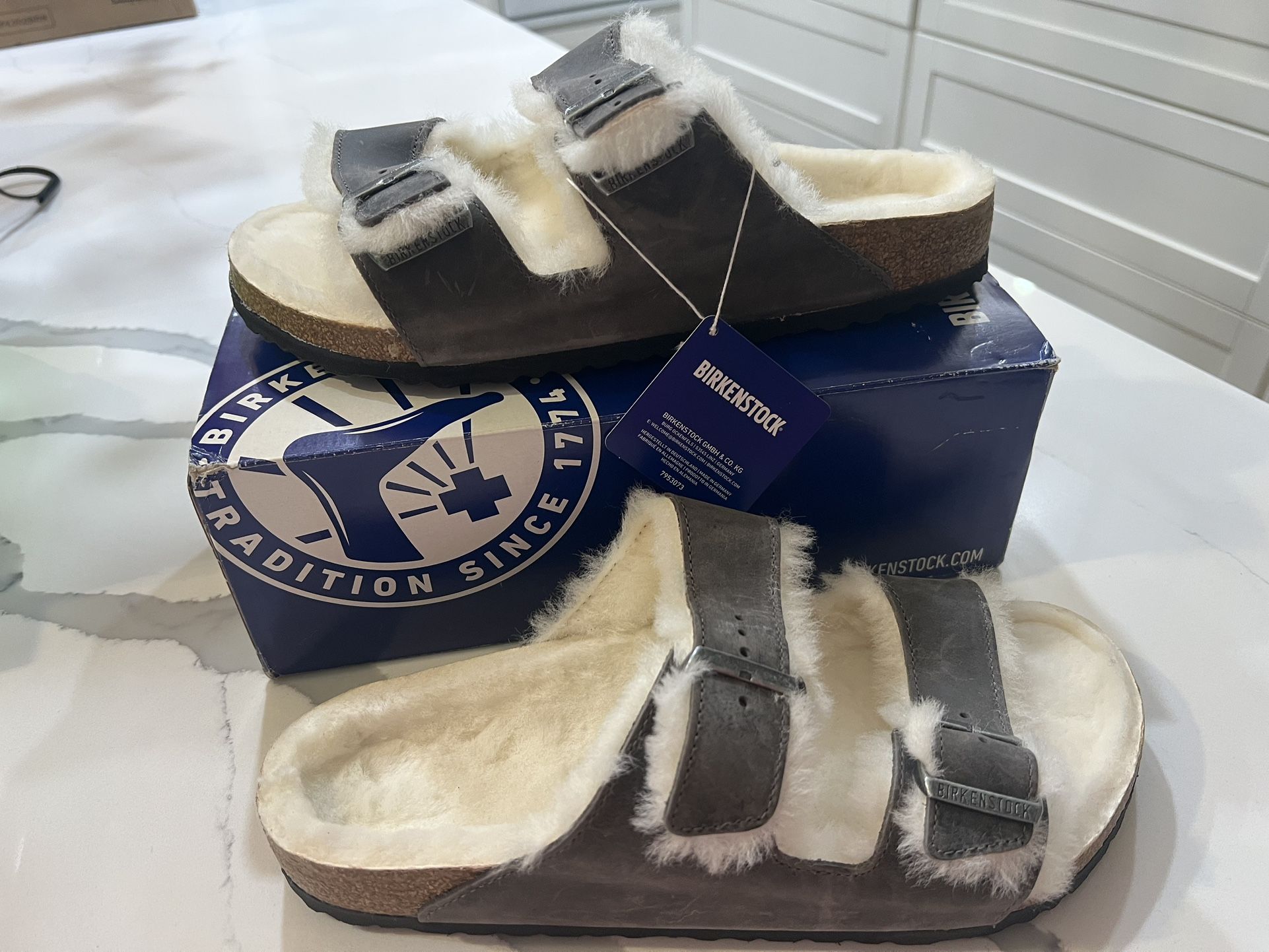 Step into comfort and style with brand-new Birkenstock Arizona Shearling sandals, size 44 (EU) / Men’s 11, in the elegant Iron colorway. • Style #: 1021067 • Condition: Brand new, never worn, comes with original box • Original retail: $159 Details: Featuring the classic Arizona design with soft shearling lining for extra comfort, these sandals are perfect for everyday wear or lounging in style. A must-have for anyone who loves quality footwear! Serious inquiries only. If the post is up, the item is available.