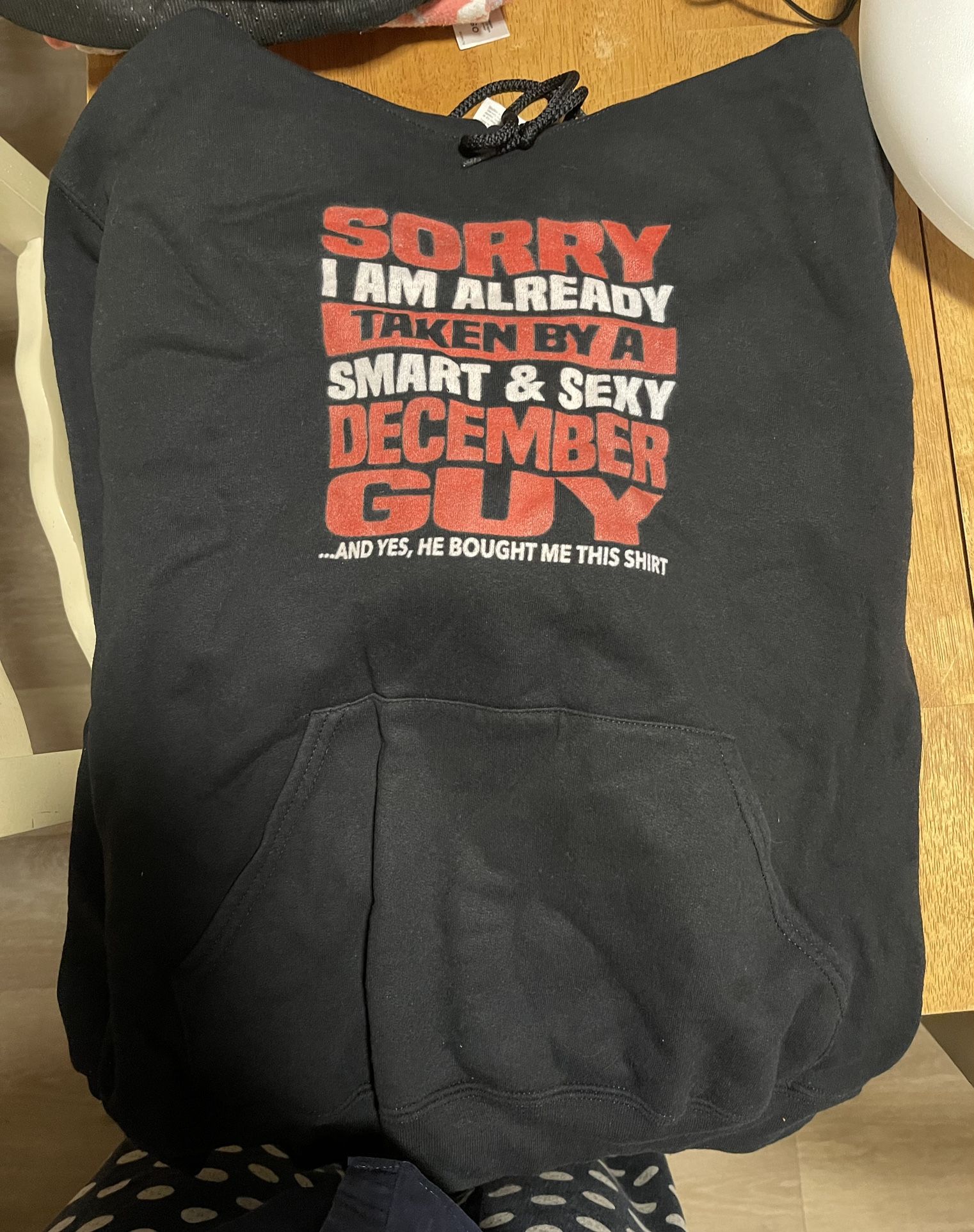 Says “Sorry, I am already taken by a smart and sexy December guy …and yes he bought me this shirt!” Wore it twice. I’m good condition. Pet free & smoke free home.