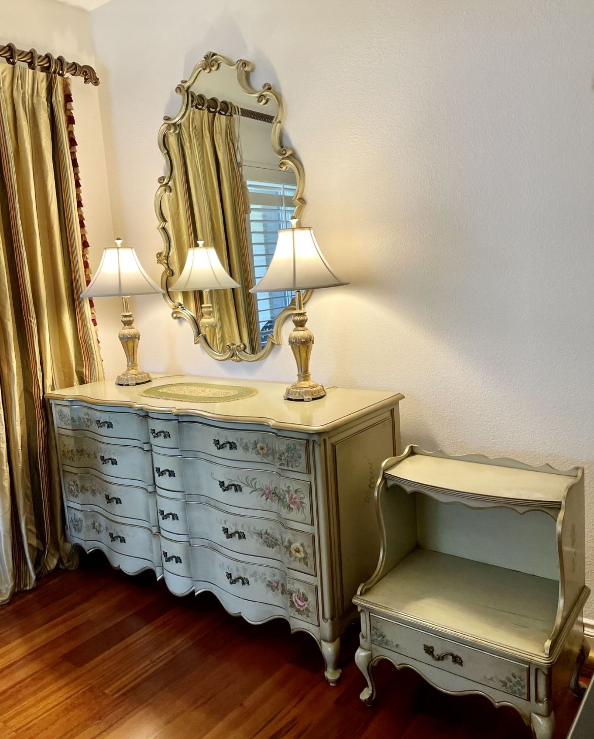GORGEOUS VINTAGE HAND PAINTED OIL PAINTING BEDROOM SET INCLUDING MIRROR, DRESSER, KING SIZE HEADBOARD, NIGHT STAND. PLEASE FEEL FREE TO ASK QUESTION.