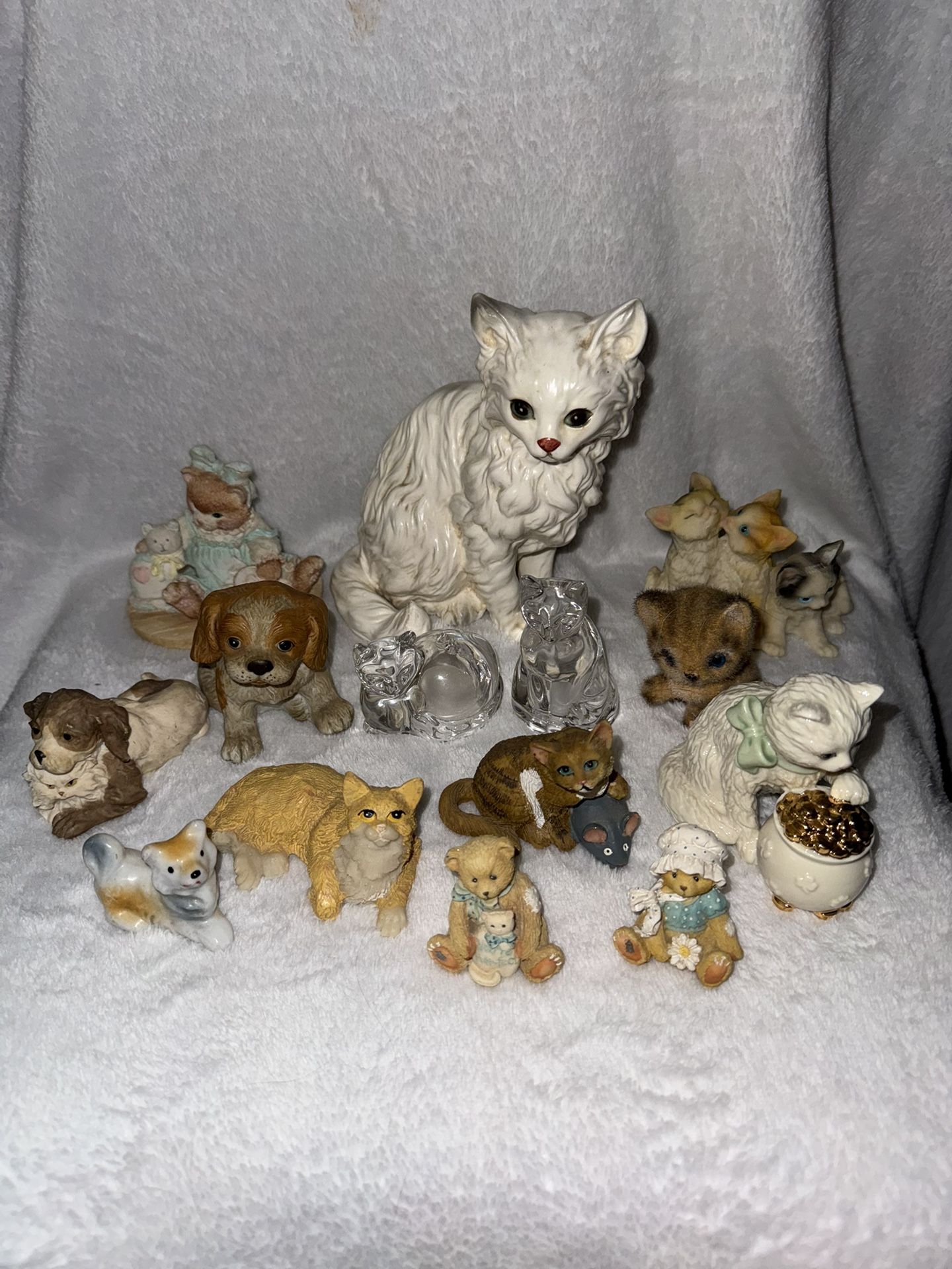 Mixed lot of 13 vintage cat and dog figurines (and a salt and pepper set). Mostly cats, but includes 3 dogs and 2 teddy bears (one holding a cat). Large white cat with blue/green eyes -includes stamp “H1517”- image search suggests it is Lefton. Lenox white cat with pot of gold (has maker’s mark). Enesco Calico Kittens figurine of cat in dress/bow doing needlepoint and petting a stuffed kitty. Entitled “Friendship is Sewn Stitch by Stitch” and marked “C21/759.” A set of clear cat salt and pepper shakers, including bottom stoppers! Spaniel puppy with stamp “1407” - internet search suggests it is Homco. A fuzzy cat with “Josefs originals Japan” sticker (this is the one damaged item, with missing fur on one paw). Figurine of 3 cats, with one cleaning another. Figurine of dog and cat cuddling. White and brown dog figurine marked “Japan.” Figurine of brown cat catching a mouse. Figurine of orange cat lounging. I’m also including a pair of mini enesco teddy bear figurines- one holding a cat that says “you’re purr-fect.”