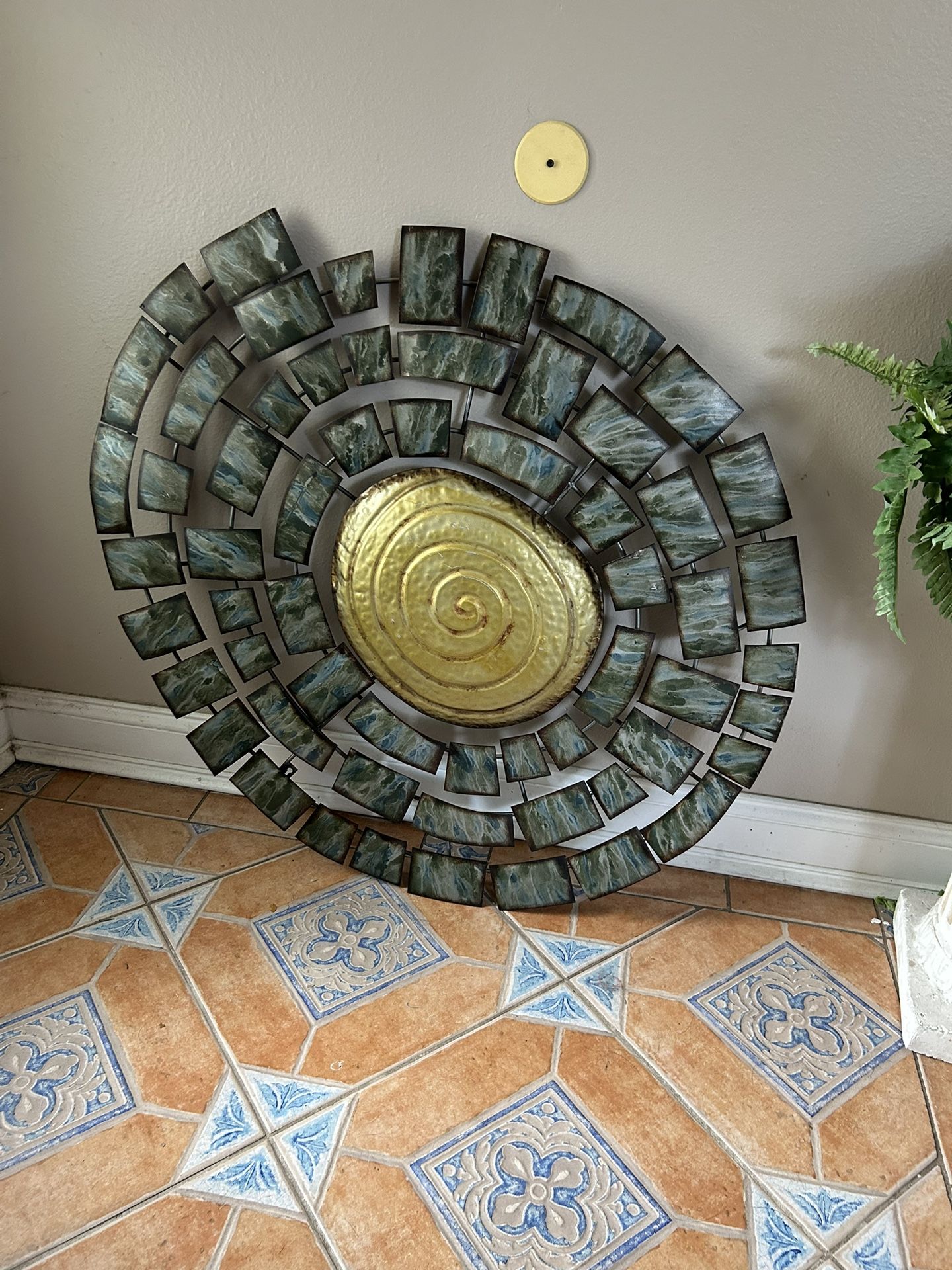 This item is a large, abstract metal wall sculpture featuring a spiral design with green, blue, and gold finishes. It is available from various retailers as a contemporary or mid-century modern-style decorative piece. Product Information Design: The sculpture features an abstract, round shape with a gold-toned spiral at the center, surrounded by a spiral arrangement of rectangular metal pieces finished in green and blue. Material: Metal Style: The design is often categorized as modern, contemporary, or mid-century modern. Pickup Details: * Located in East Orlando near UCF (32817) * No holds, first come, first served * Sold "As Is" with no exchanges, cancellations, or refunds Please note that the post will be removed once the item is sold. Check out my profile for other listed items!