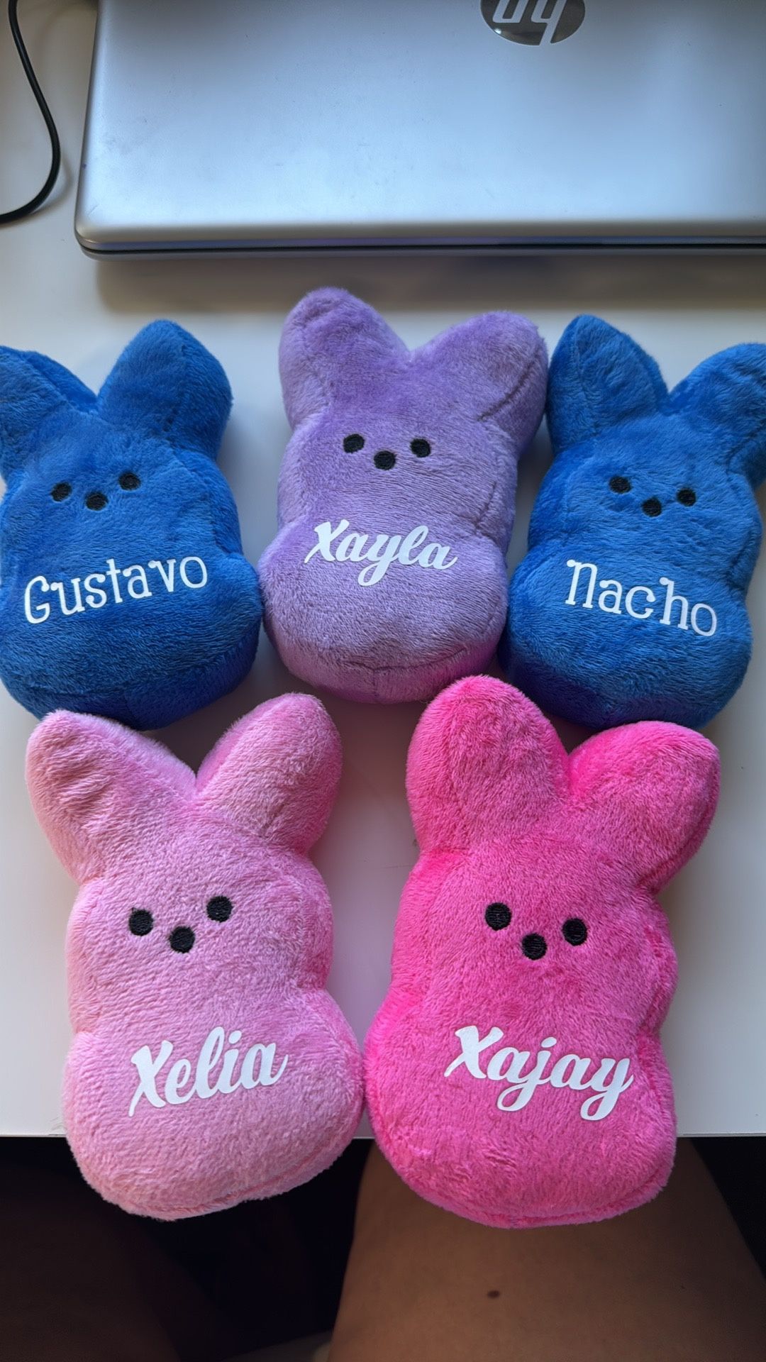Adorable Easter peeps bunnies available in Pink, blue, yellow and and mint pastel colors, also more vibrant colors. approximately 7 inches tall. Can be personalized and Perfect for adding to an Easter basket or using as festive home décor. ✨ Details: • Personalization optional • Great for baskets or decoration 📦 Ordering Info: • Deposits required to place an order • Quantities are limited 💲 Pricing: • $5.00 Turnover time within 24 hours of ordering. Porch pick up in Chino or delivery fee applies based on location. Vibrant colors are 6 inches. Look at my other listing for Easter.
