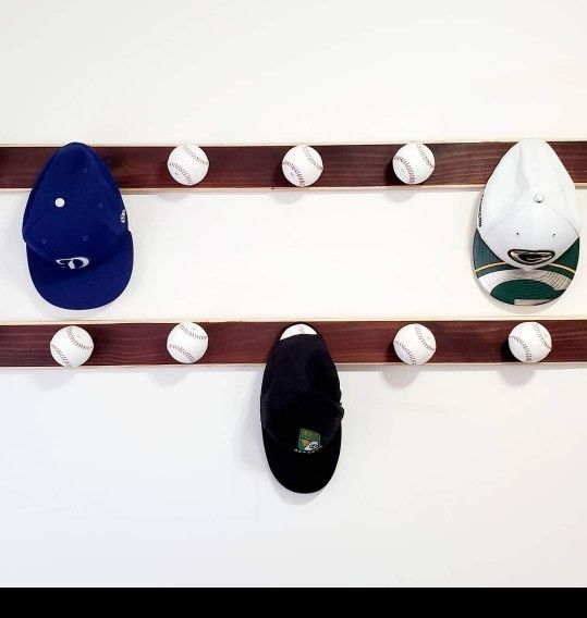 Custom made baseball hat holder. Makes a unique Father's Day gift. This guy is 3 feet long and holds 5 hats. Comes ready to hang. Here for any questions.