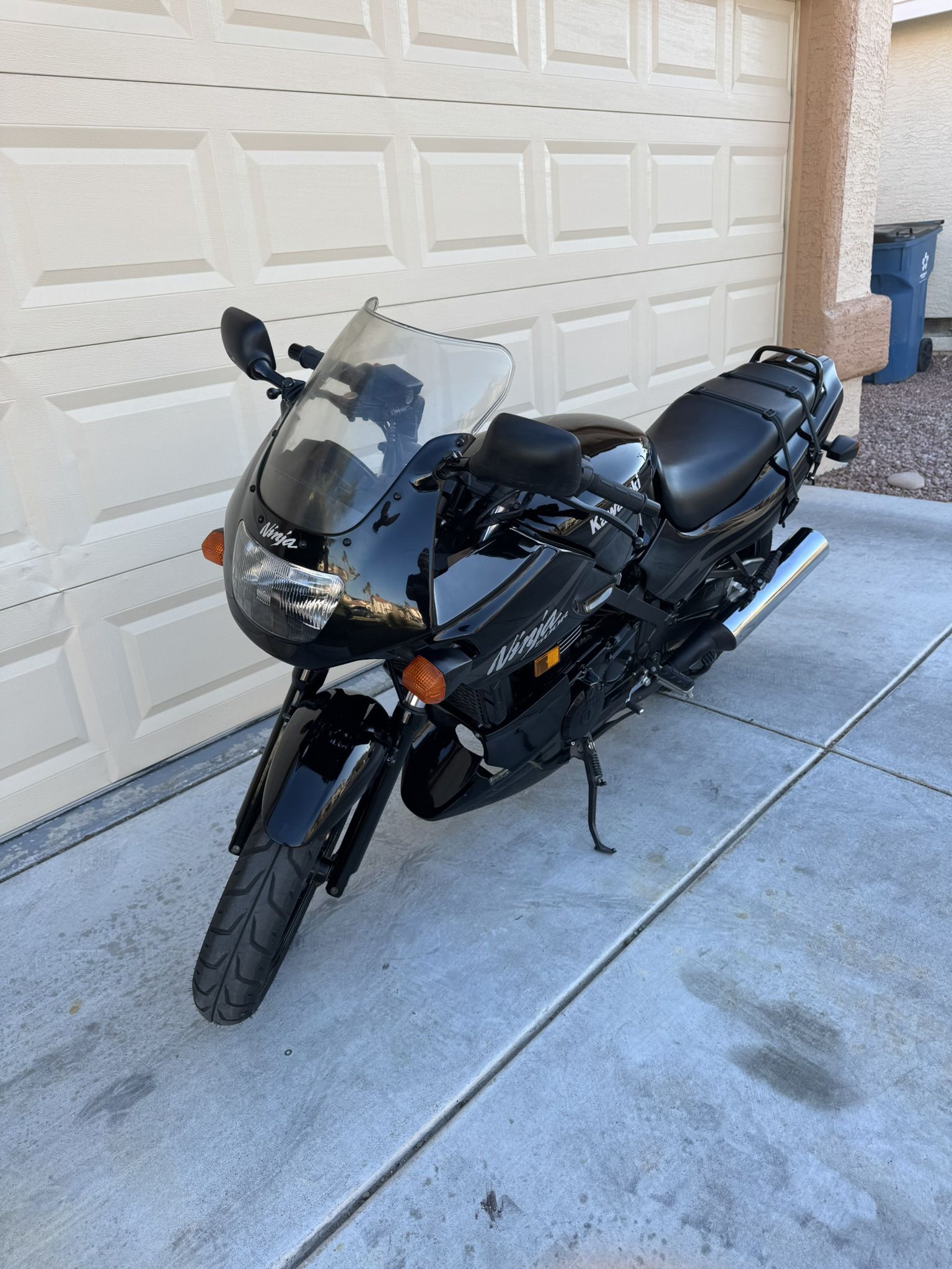 One owner, only 3600 original miles. I took very good care of this bike it's been garage kept only used it to go back-and-forth to work during the day. Just recently pulled it out which I do a couple times a year always drained the fuel when stored. Just got it back from the shop after taking it out of storage carburetors rebuilt all new fluids synthetic oil change brand new Michelin tires new brakes new clutch,tuneup,safety inspected,this Ninja runs and starts beautifully. Never laid down nor raced, i've always babied this Bike. New black fairing windshield, have new chrome and black rubber grips not put on yet. Has USB port for cell phone charger. New battery. All original has a couple of minor scratches no dents or dings. It's a very nice clean bike.Also have two brand new black helmets with communication coms, Helmets are brand new in box and are flip ups for half face and convenience, helmets also have rear Bluetooth lights.Very nice comfortable helmets. Full package for $2600. All current receipts for tuneup and maintenance. Again title in hand. very fast and fun Bike...No low Ballers