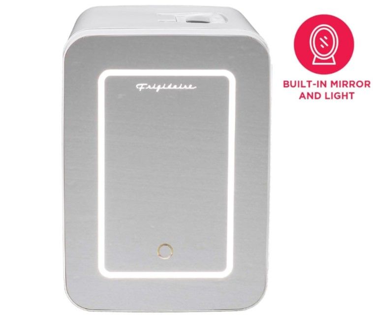 Brand new in box FRIGIDAIRE Mini Personal Fridge Cooler, LED Lighted Mirror, 6.5L Capacity, Chills 9 Cans, or Makeup and Skincare, Portable & Compact