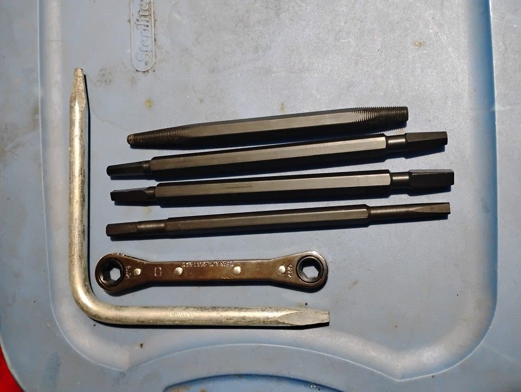 4 black steel eazy out stem rods 1 angled seat tool 1 ratchet