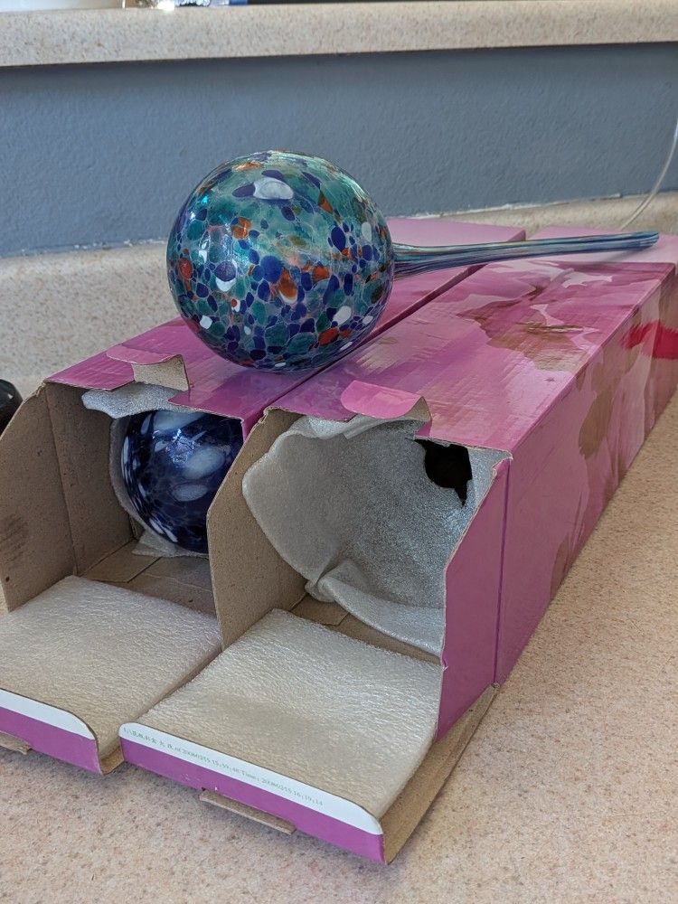15 " Aqua Globes Hand Blown Glass Watering Bulbs. They water your Plants for You. New in Box. 1 Blue 1 Multi Color. Durango and Blue Diamond.