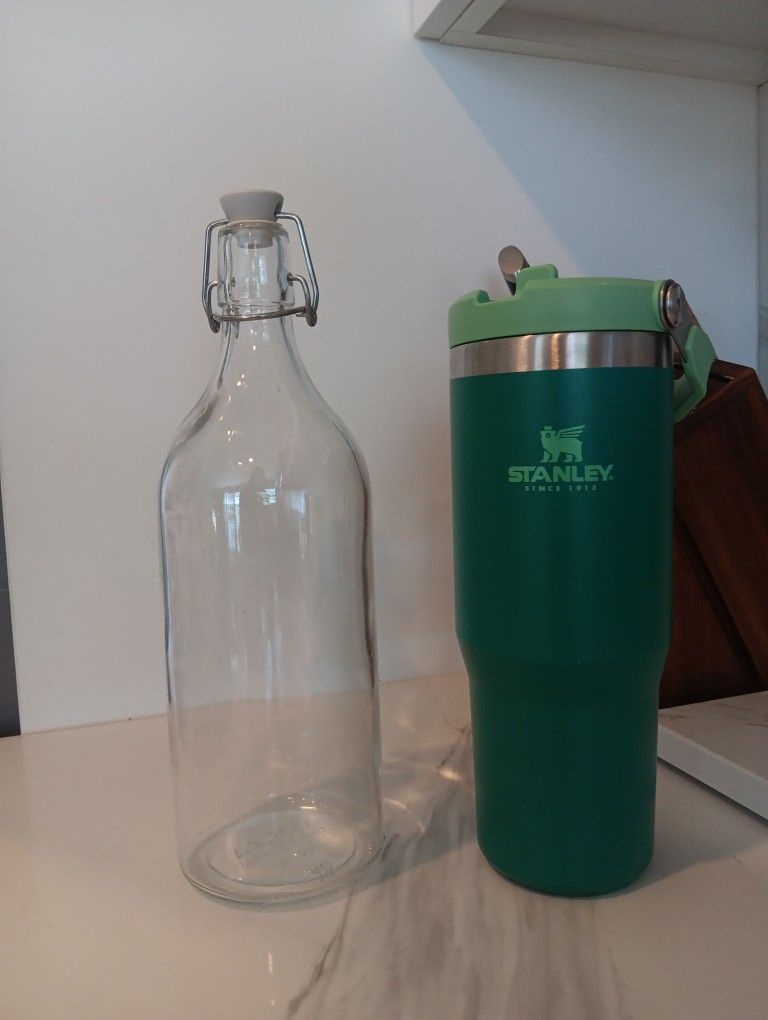 20 tall glass jars 20x $70 Not broken With lids Used ones on a wedding Some herbs or fruits and go to go. Perfect for an event. Stanley Cup, not for sale, is only to show the bottle size.