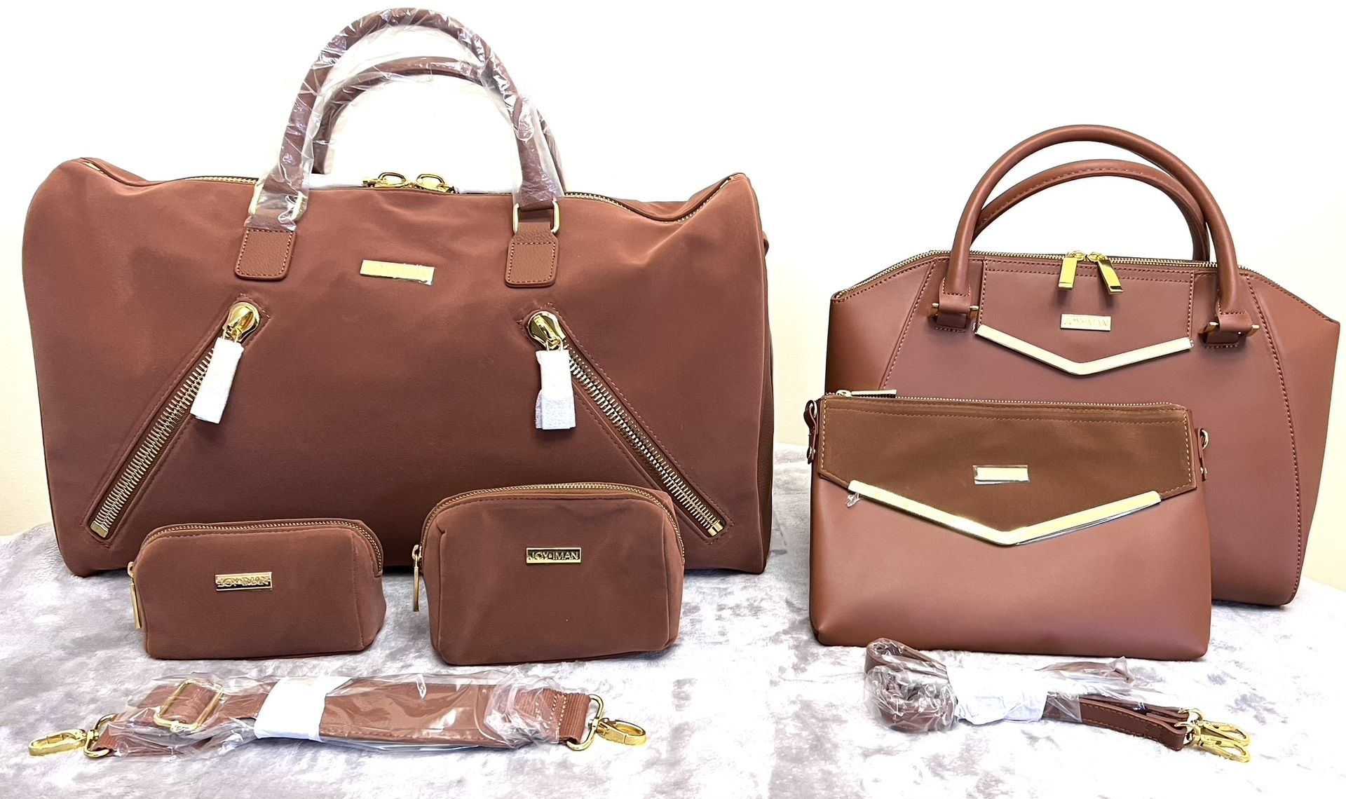 JOY & IMAN Luxe Velvet Leather Brown travel Bag, 2 Makeup Bags, Purse & Satchel