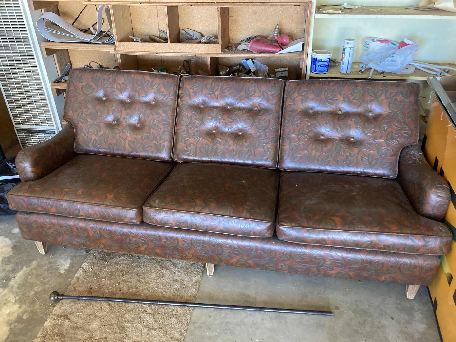 We have a large antique leather couch for sale. It’s in good shape aside from the chew damage on top from the former owners pet. It’s fixable and has leather pattern pieces that can be used to fix up as shown in the wrapping in the pictures. Price is $40.00 must come pick up with truck will not fit in SUV.