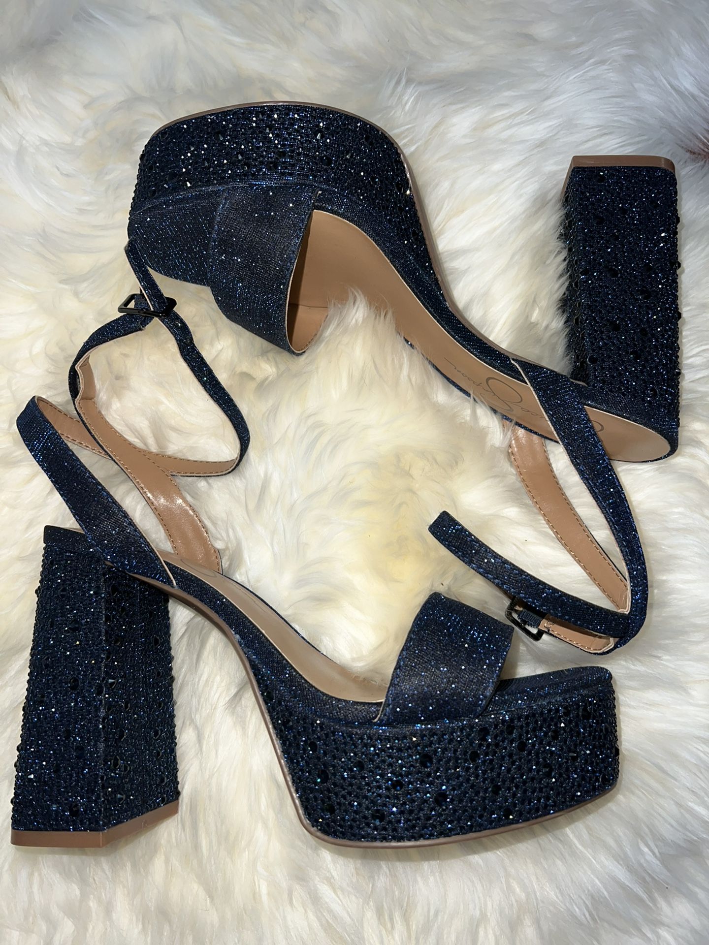 Jessica Simpson block heels Navy blue with glitter & rhinestones open toe with crossed ankle strap Super cute and fun heels to make an outfit statement. Only reason I’m not keeping is because I unfortunately need a bigger size now BRAND NEW, nothing wrong with them Asking for $70 (retail $110 +tax) First come first serve