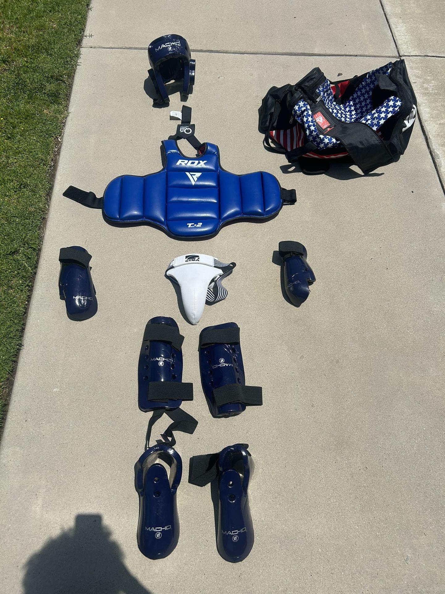 -2shin guards -groin protection -two gloves -head gear -two feet protection -chest protection(reversible to red)