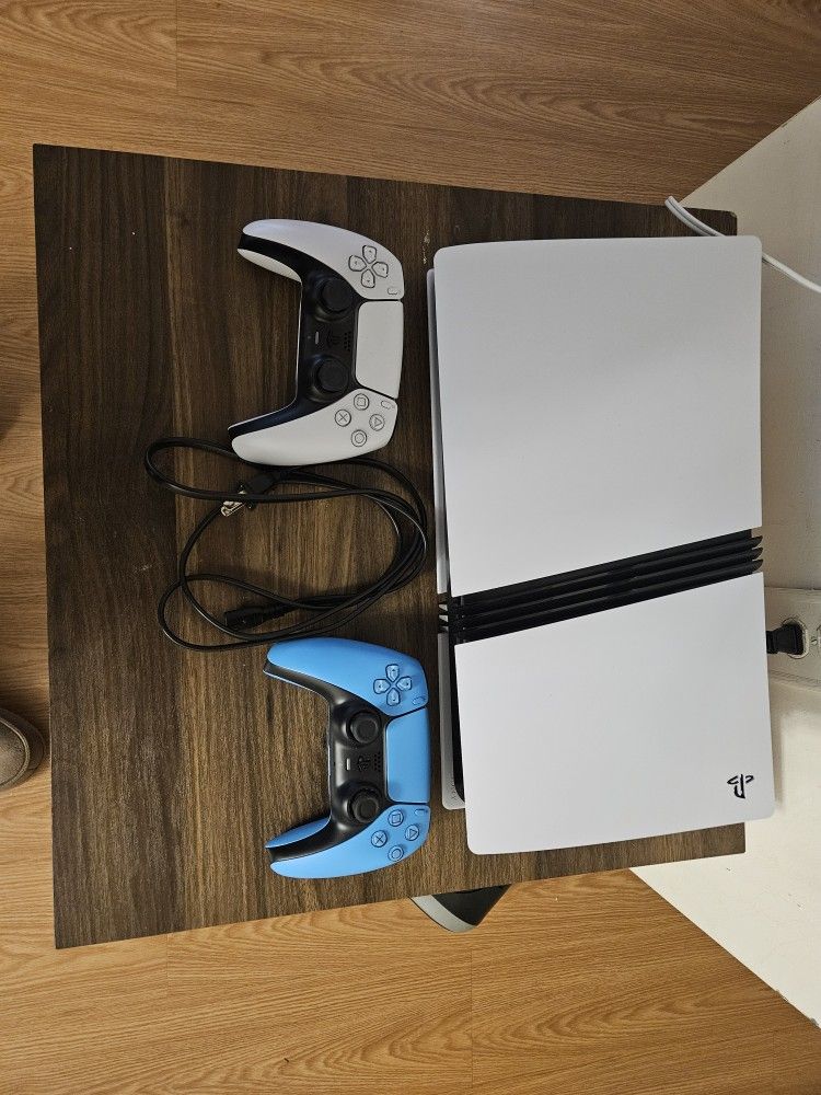 New to Offer Up. Local(Quincy,MA)/Cash Only. LF $750 but negotiable. Will come with: ● PS5 Pro 2TB ● 2TB SSD w/ Heatsink ● Original Controller (plus light blue version) ● Power Cord and HDMI Cable ● Original box w/ manuals ● USB-C to USB-C cord (non original) ● Analog stick replacement kit Only owned for 5 months. Still under warranty with BestBuy. Not sure if that helps you in any way, but thought I'd mention. Blue controllers right analog stick was replaced by myself, hence the missing ring, but still works perfectly. Also, have a red PS4 controller and cable that goes with it. Giving that away for free.