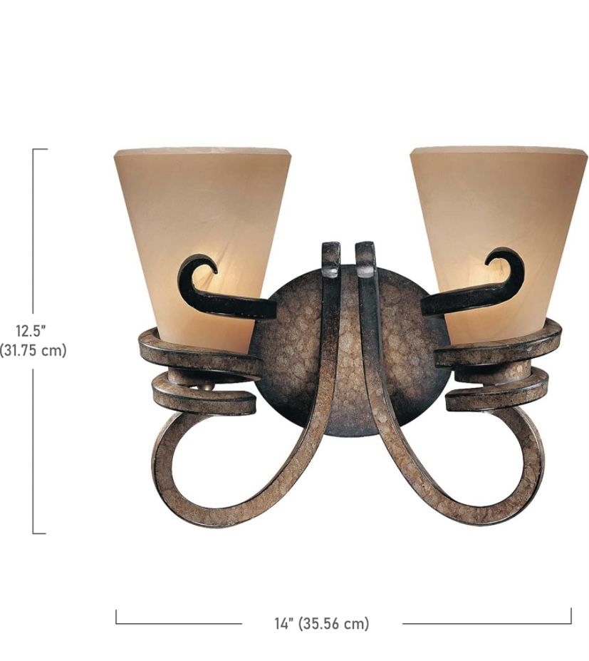 Never used or installed (pictures are for reference). Paid $200 and still sells new for $200. Local pickup please. AJ near Ironwood and superstition. VANITY LIGHT DIMENSIONS: 12.5" High x 14" Wide x 8" Deep, Weight: 8.82 lbs, Wall Plate Mount: 5.13" W MEDIUM BASE LIGHT SOCKET: 200 Max Wattage, (2) 100 Watt A19 Style Bulbs, Compatible with E26 Base, Case Use: LED, Fluorescent, Halogen or Incandescent Bulbs, Does Not Include Bulb(s), Dimming possible when used with Dimmable Bulb and Dimmer Switch INSTALLATION: Lights Up or Down Position(s). Includes 7" Long Wire and Comes with Hardware Mounting Kit Can be used in DAMP Locations, Approved by Underwrites Laboratories (UL) FINISH: Tofino Bronze with Marbre Graber Glass Bulbs are not included with this fixture Traditional styling makes this fixture a perfect showpiece for any home The double coating of Dark Brushed Bronze finish ensures your fixture will stay true to design for years to come Utilizes A19 MED bulbs Spumante Lace Glass shades included