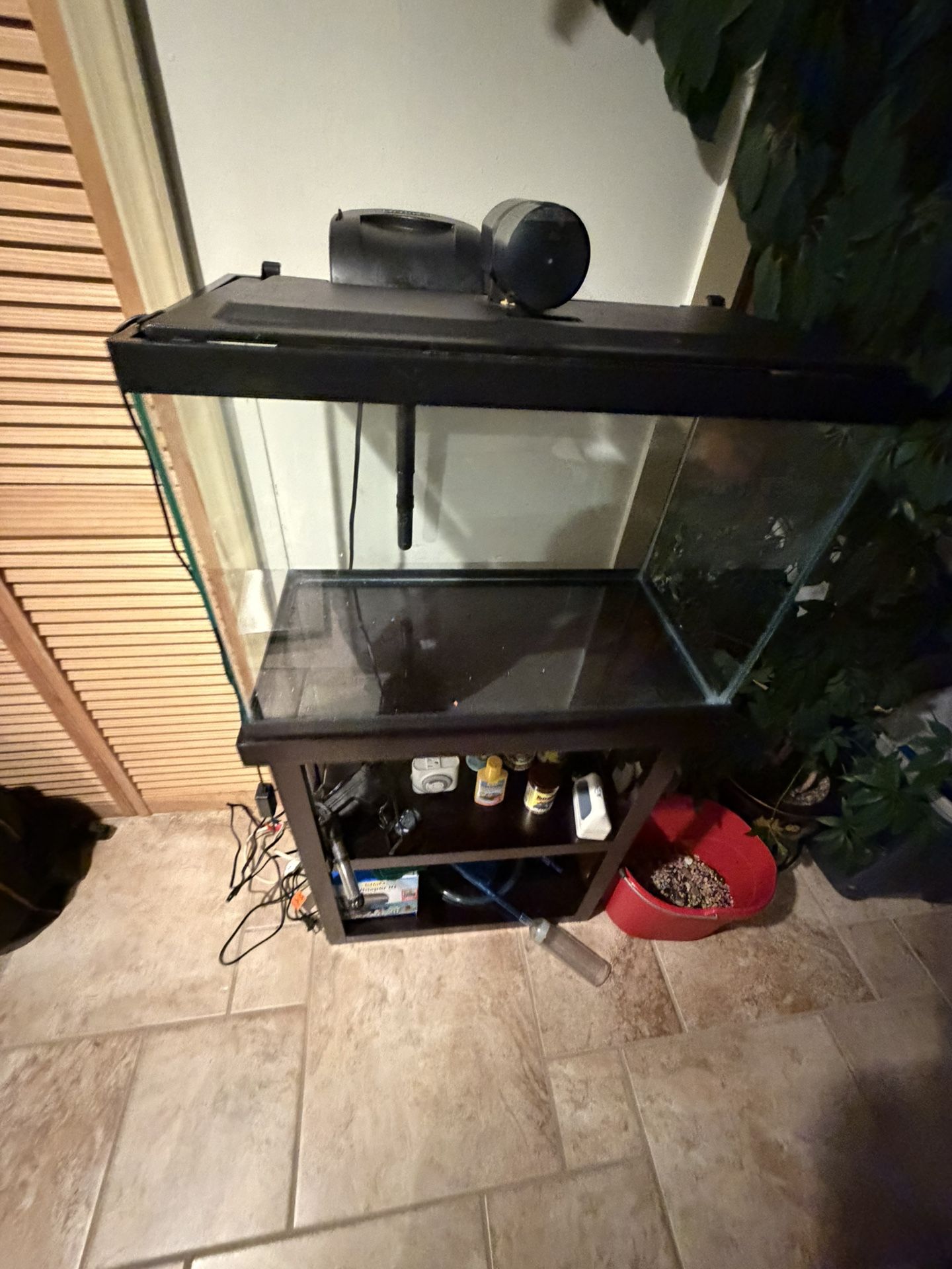 Comes with tank, stand, filter, extra filter, rocks, three bottles of food, multiple other cleaning items.