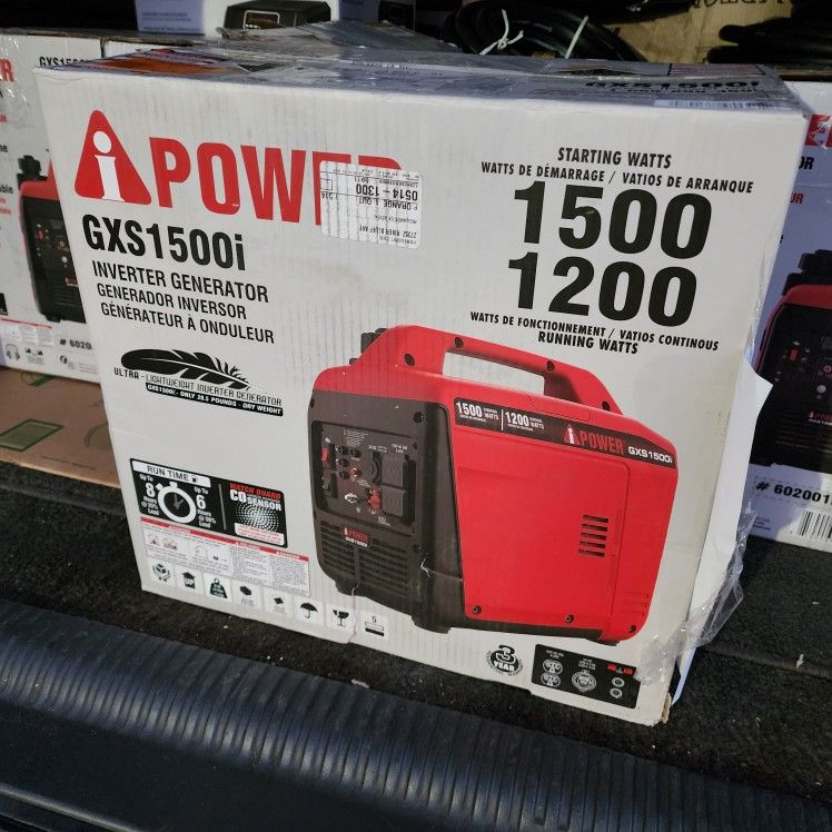 Open box item looks brand new will start up and load test before you buy pick up in Fullerton Powered by a 60cc Overhead Valve (OHV) high performance 4-cycle air-cooled gasoline powered engine 1,500 starting watts - 1,200 running watts Advanced inverter technology provides less than 3% THD of clean power output, making it safe for sensitive electronics Low idle technology extends runtime of up to 8-hours at 25% load and 6-hours at 50% load Quiet inverter operation is ideal for home, camping, tailgating and RV usage Parallel equipped: complete with parallel ports and cables for double the power output when linked together Watch guard carbon monoxide CO sensor with auto shutdown, monitors and reacts to carbon monoxide (CO) levels Ultra lightweight design for superior weight reduction, weighing only 29.5 lbs. Control panel includes 1 of 5-20R duplex (20 Amp, 120-Volt) receptacle and 2 USB receptacles (1 USB-A 3.6A and 1 USB-C 3.0A