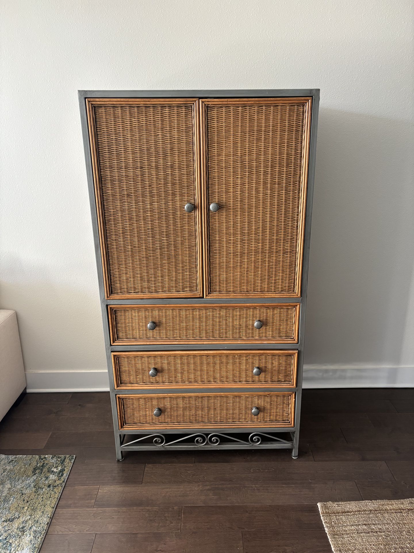 Armoire (67.5”x 36” x 24”) Side Table (28.5” x 49” x 14.5”) Coffee Table (16” x 41.5” x 20”) End Table (22.5” x 22” x 20”) Chair (34” x 33” x 27”) Good condition!