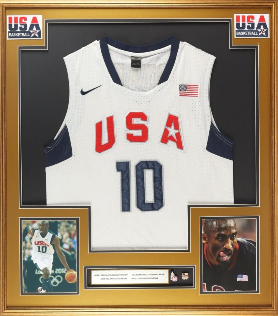 2008 framed Kobe Bryant Olympics nike jersey with patches and pictures and jsa coa, goes for 1000 to 1200