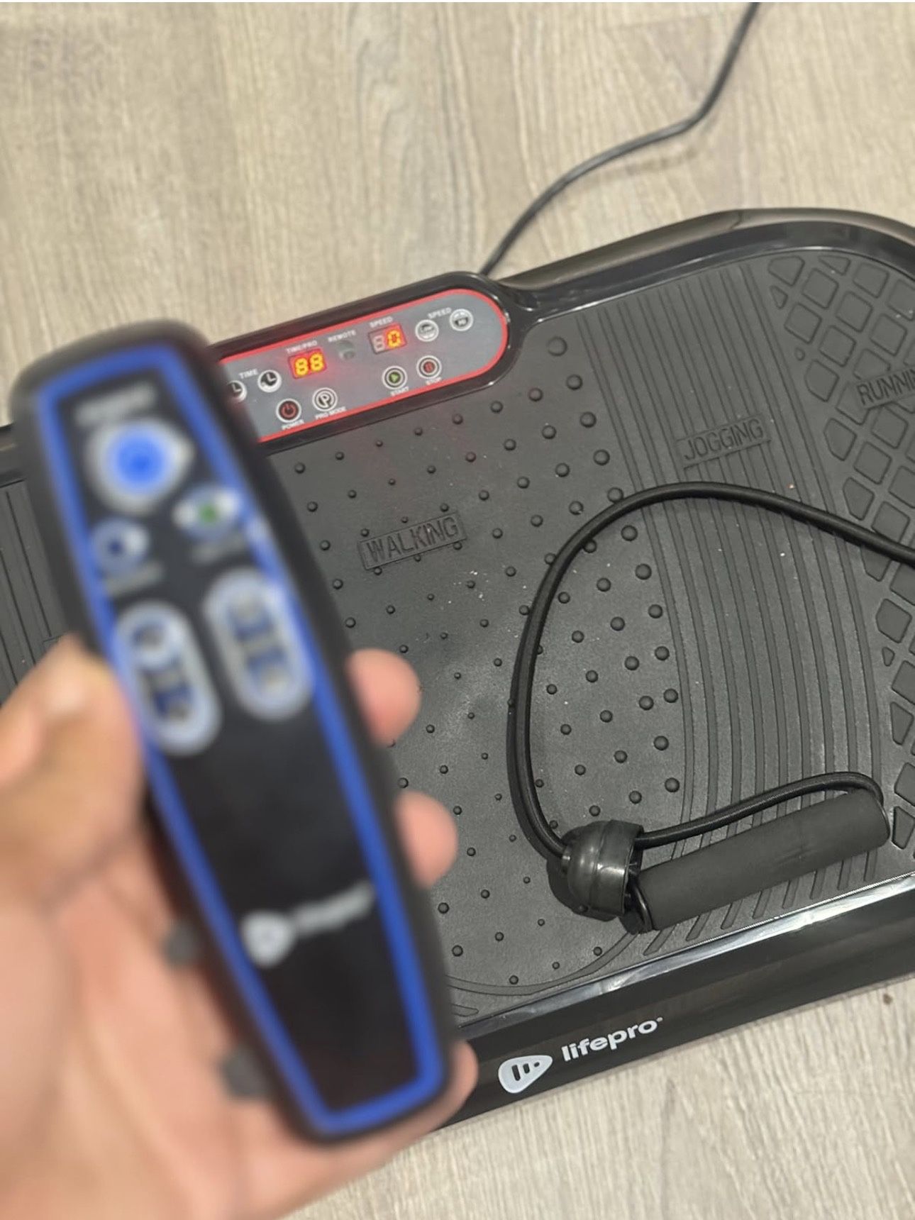 Lifepro Waver Vibration Plate Exercise Machine for Lymphatic Drainage, Muscle Activation, Full-Body Workout Vibrating Platform Remote included (with plastic on it) along with the resistant bands shown Works perfectly, plugs into wall 99 resistance levels 2AAA batteries required for remote (works without remote too) 440 horsepower 1-99RPM Great for full body workouts and for muscle recovery Non smoking household