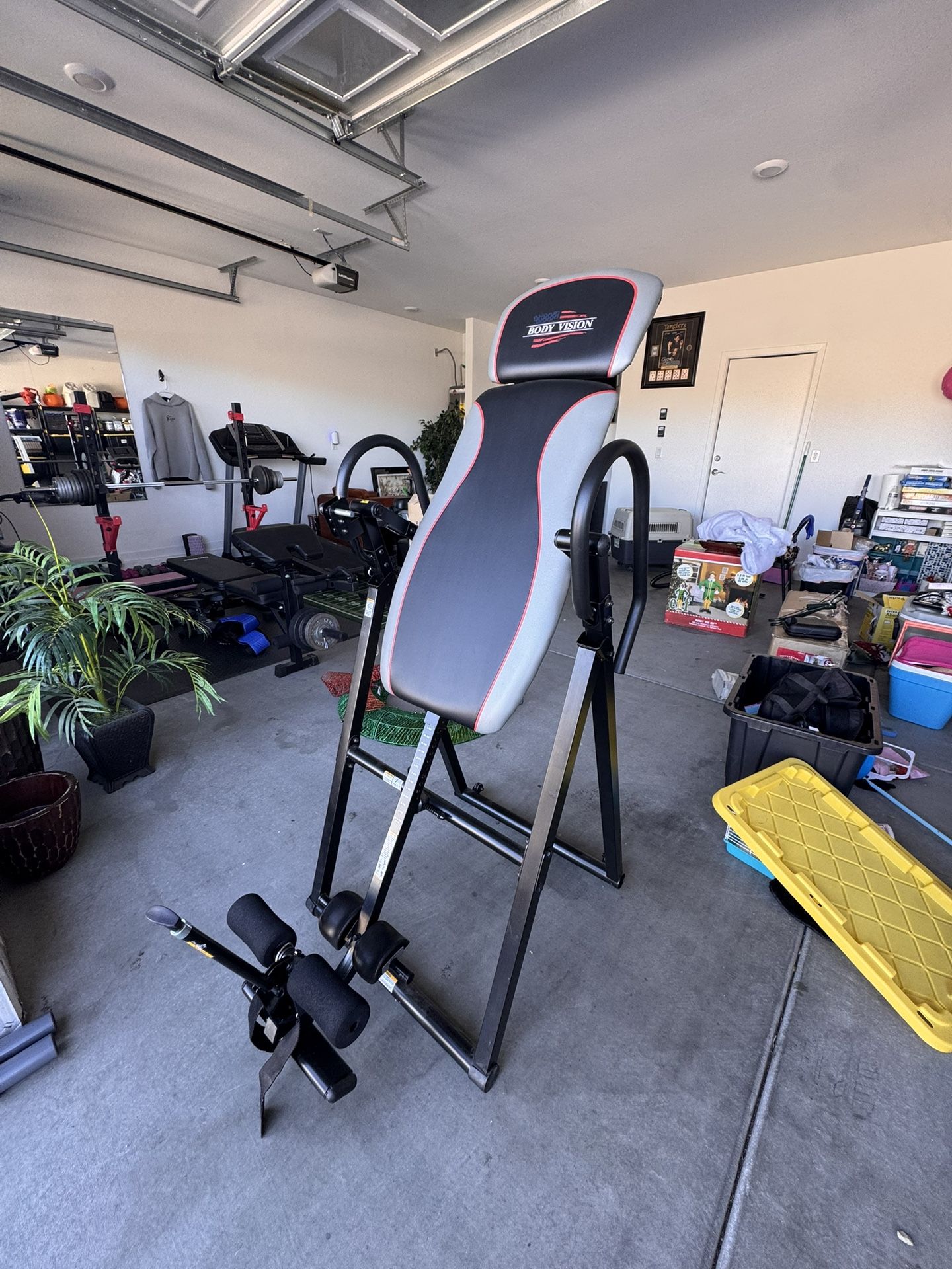 This is a Body Vision inversion table, likely the IT 9410 or a similar model. It is designed to help relieve back pressure, reduce stress, and improve flexibility through spinal decompression. The table features a heavy-duty frame and a foam-padded backrest for comfort and support. It includes comfortable foam ankle rollers and a 4-point base frame for stability. The design is often foldable for convenient storage.