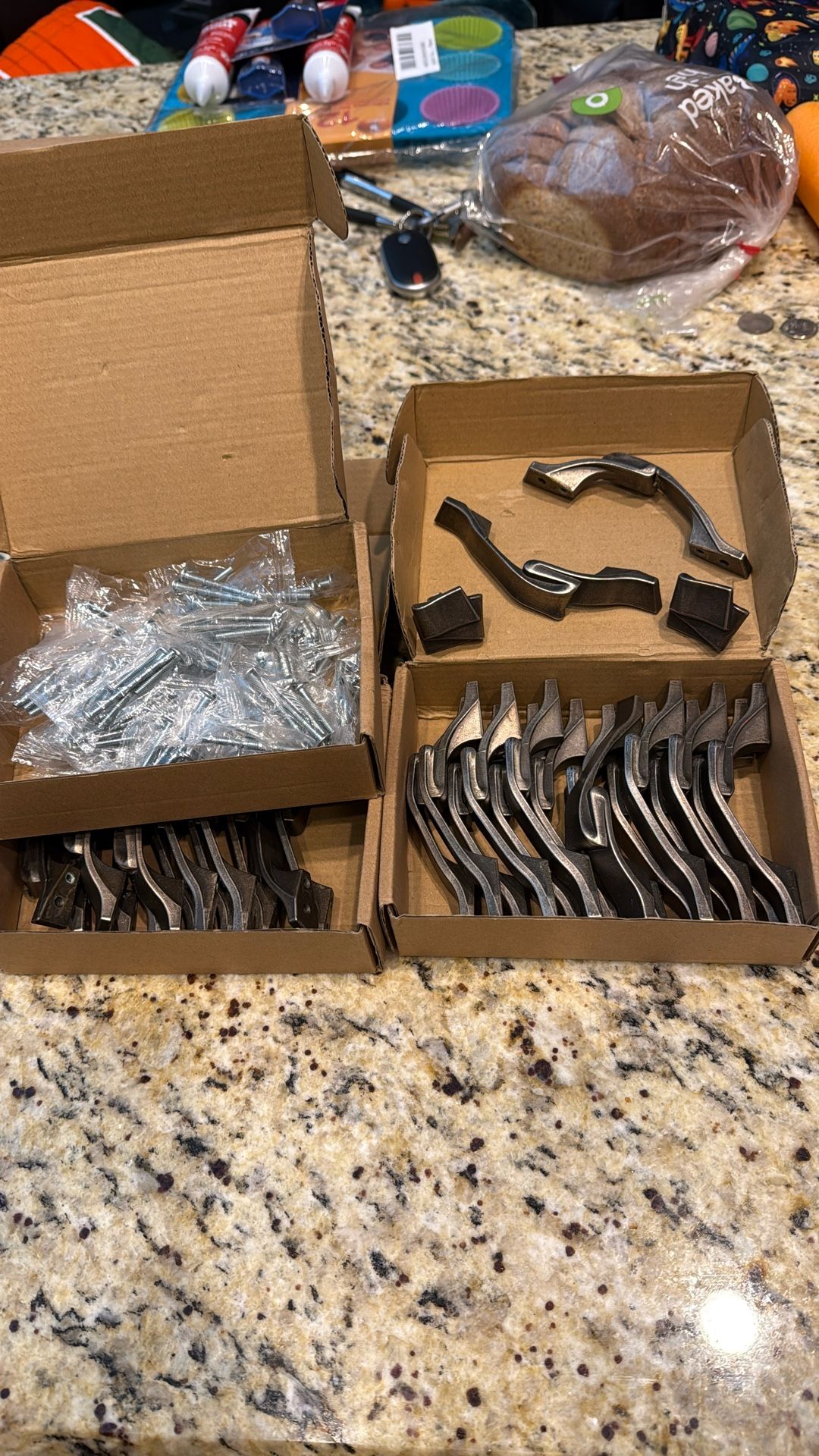 3 inch drawer/cabinet bronze-colored pulls with screws. Two drawer or pantry knobs.