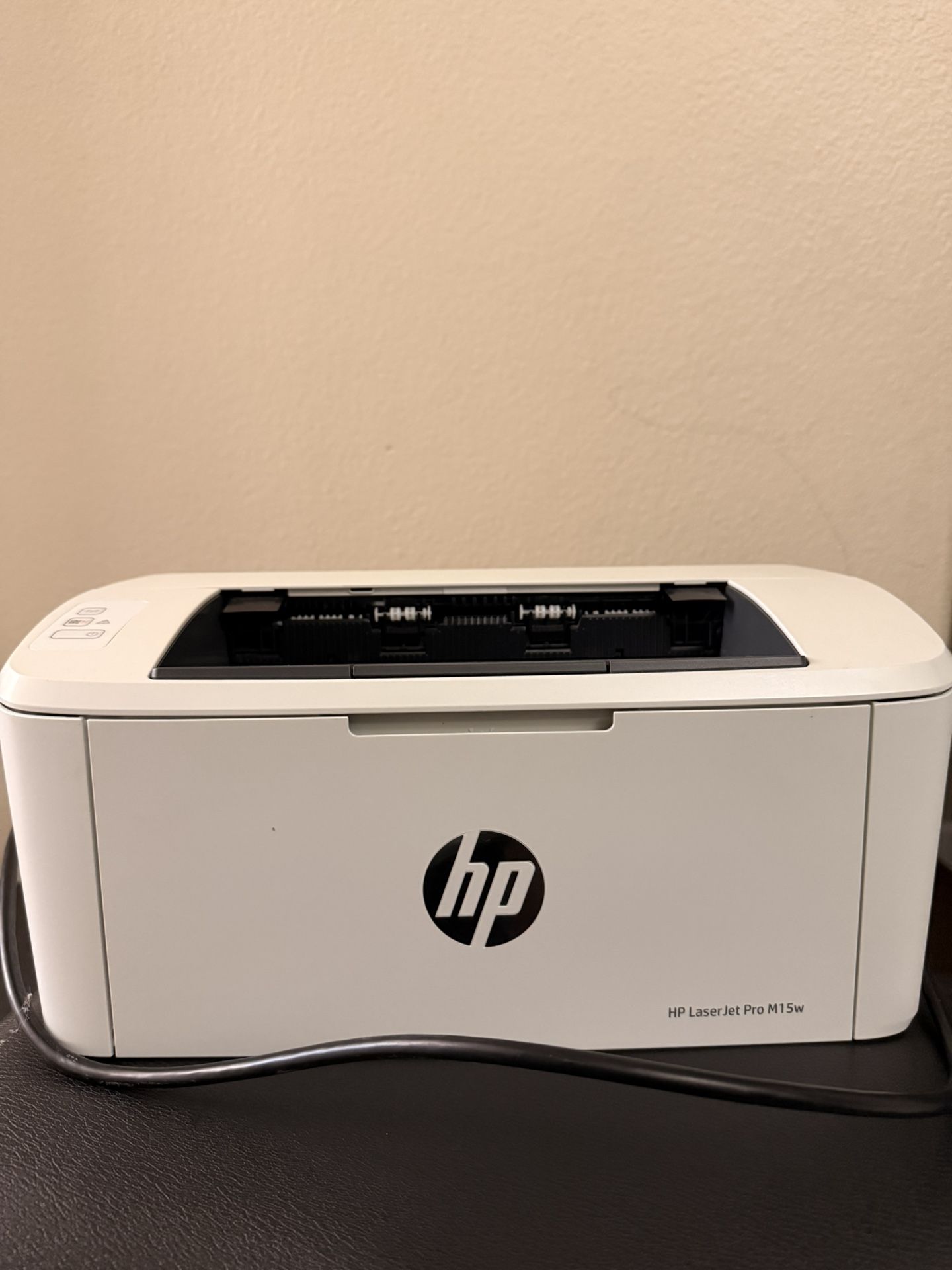 HP LaserJet Pro M15w wireless black‑and‑white laser printer. Compact size, works great, includes power cable (and toner cartridge). Selling because of downsizing; local pickup only. Cash or Venmo - $50 OBO