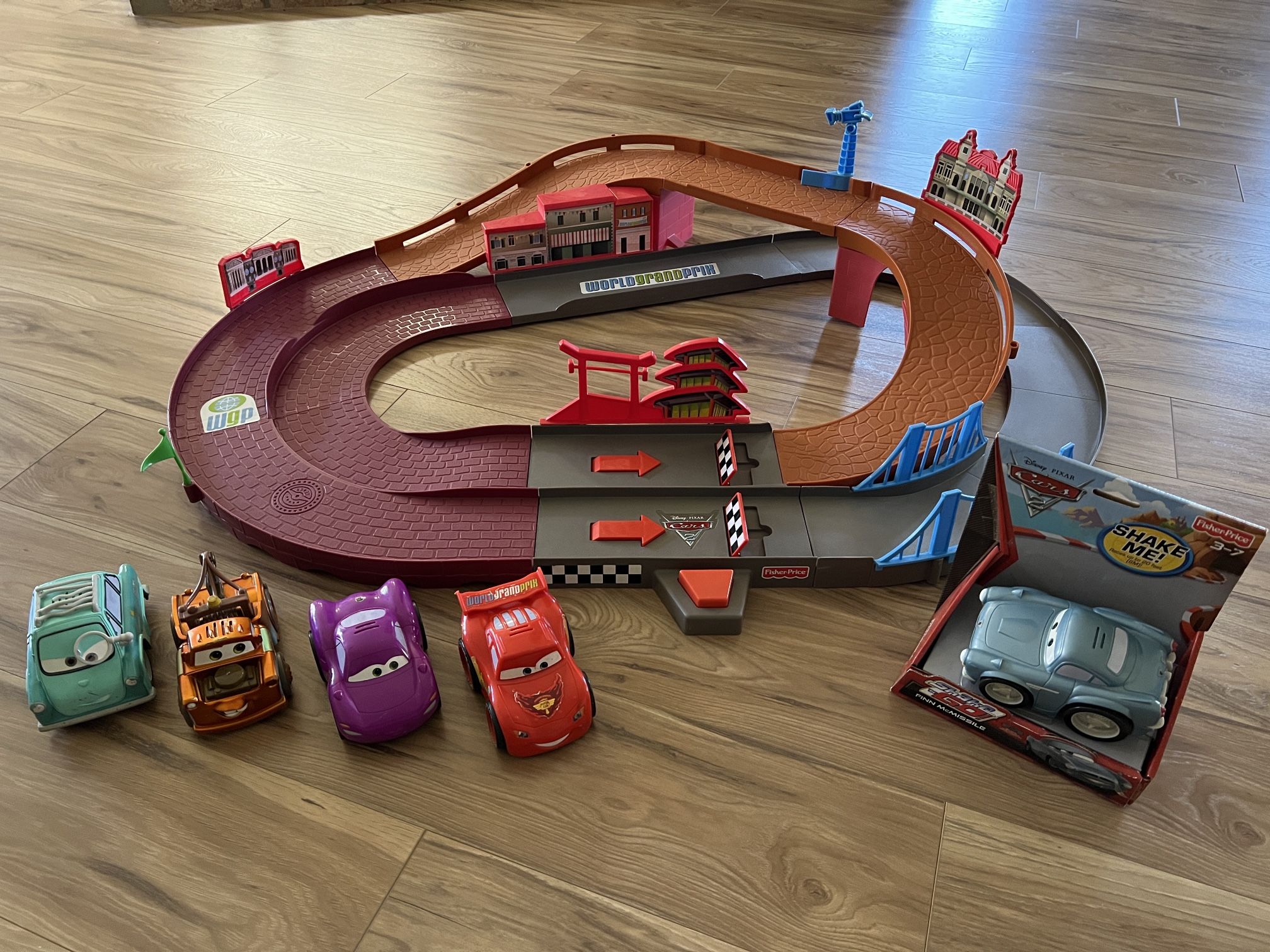 CARS 2 GRAND PRIX TRACK SHAKE ‘N GO W/ NEW FINN MCMISSILE. ALSO INCLUDES 4 USED CARS. LIGHTNING MCQUEEN, TOW MATER, HOLLEY SHIFTWELL & PROFESSOR Z (ZUNDAPP). DISCLAIMER: ALL ENGINES REV WHEN YOU SHAKE THEM. HOLLEY MAKES IT AROUND THE TRACK GOOD, BUT THE OTHER 3 HAVE TROUBLE. MCQUEEN HAS DELAYED START TYPICALLY. TRACK IS JUST MISSING A COUPLE OF FLAGS.
