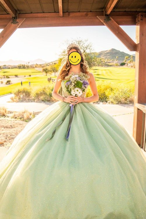 Gorgeous sage with gold accents dress. Used only once! Lol. It's a size 8 but my daughter is a women's small, so not sure how the sizing works.
