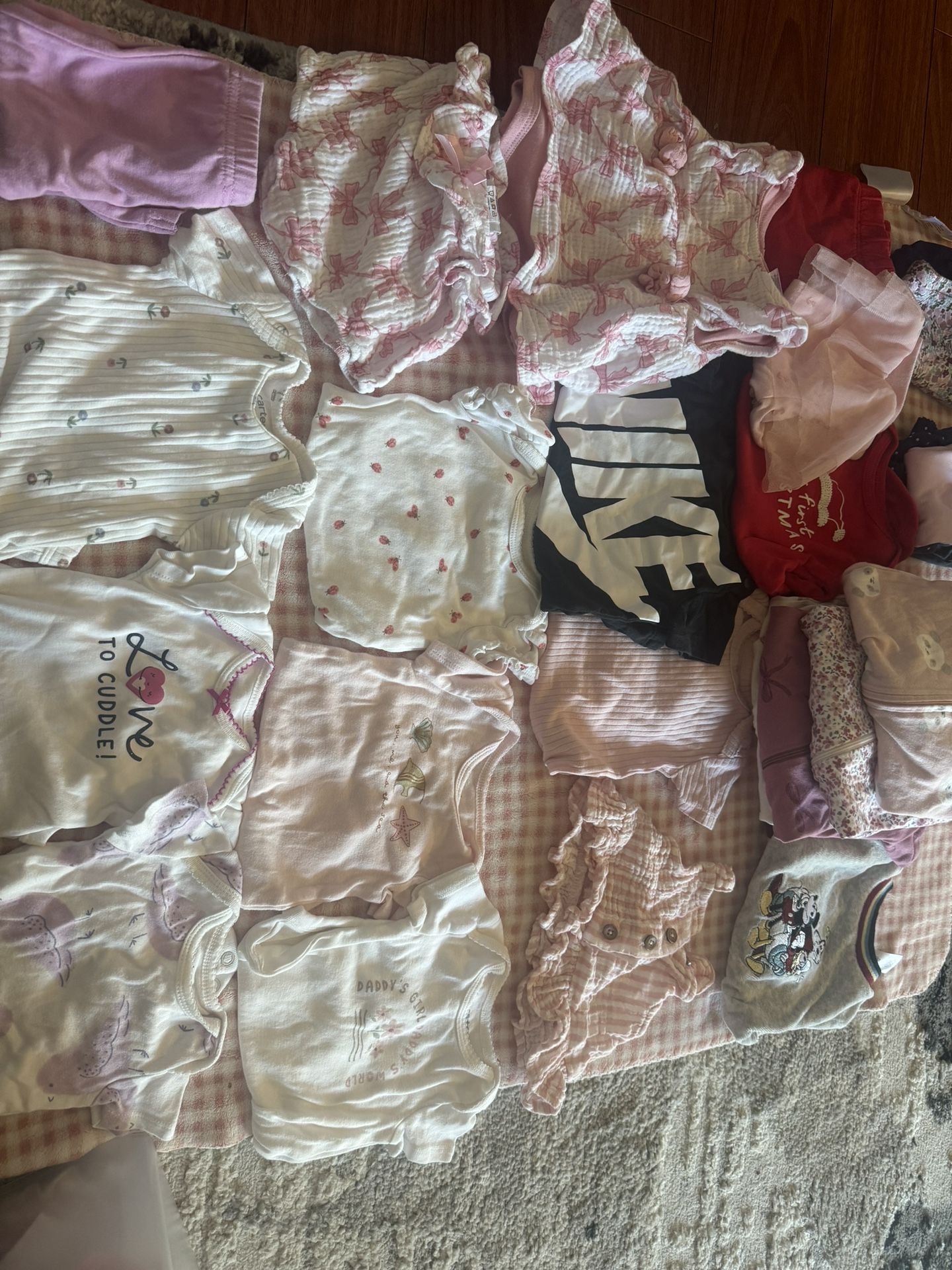 Babygirl size 3 months Gently used 3 pieces for $10 Onesies , pajamas , pants 1 bows dress $10 Pajamas $5